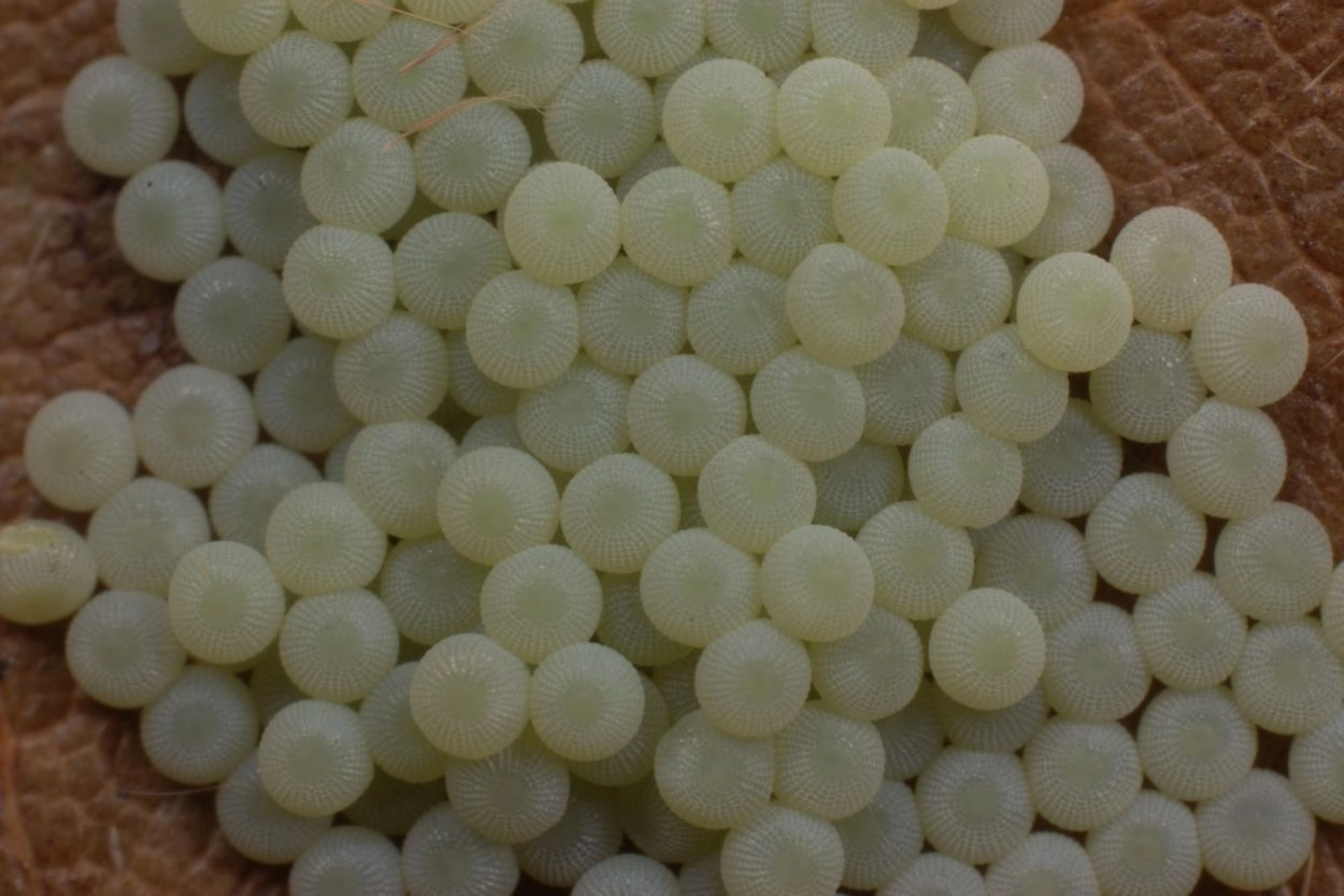 Tot 40 mm; plomp; lichaam groen met geelachtig witte spikkels en geelachtige ringen tussen de segmenten; over de rug een geelachtig witte middenstreep en een kleine identieke lengtestreep over de spiracula; achter de kop en op de rugzijde van het elfde segment opvallende gele dwarsbanden; kop licht bruinachtig groen.