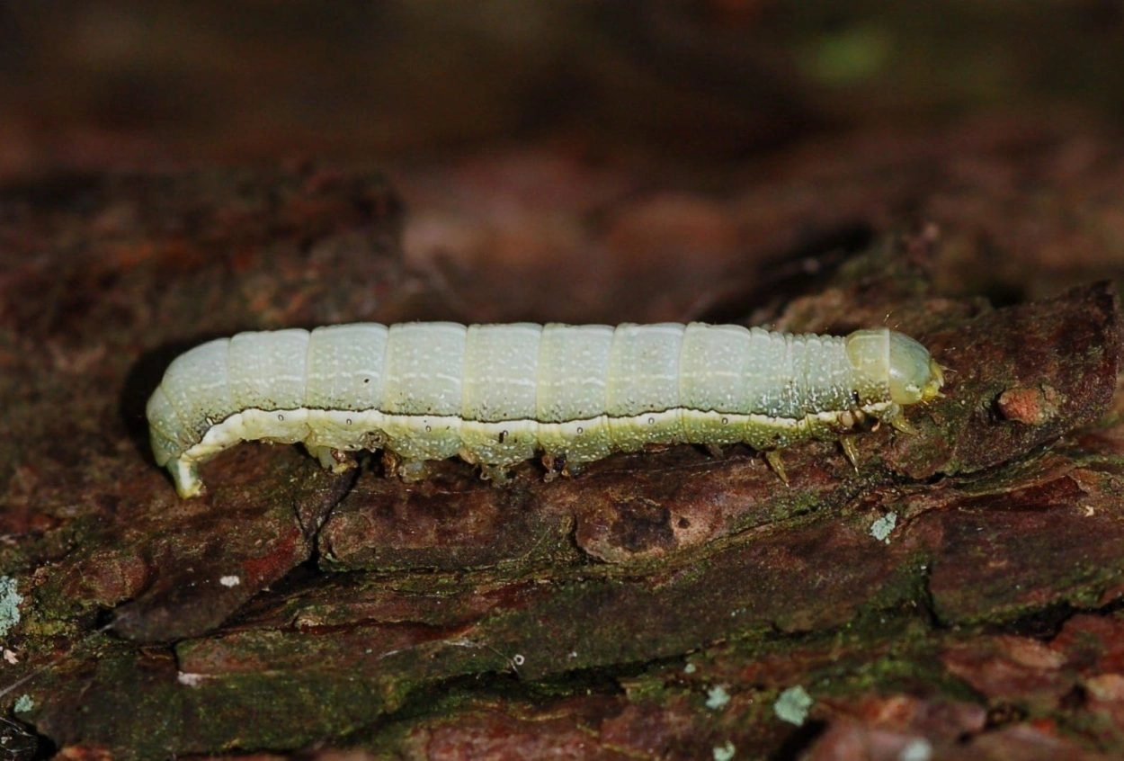 Tot 40 mm; lichaam varieert in kleur van blauwachtig groen tot geelachtig groen of donker grijsachtig groen, met uitgebreide witte spikkeling; over het midden van de rug een brede, witte middenstreep met aan weerszijden een smallere witte lengtestreep; over de spiracula een witte of geelachtige lengteband met zwartgezoomde bovenrand; kop lichtgroen of groenachtig bruin.