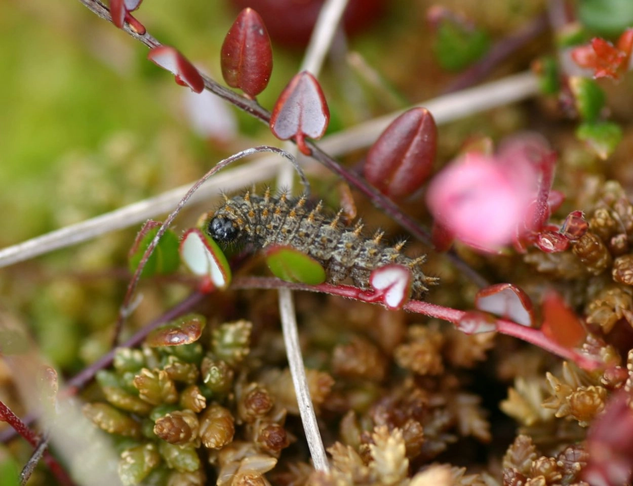 De rupsen komen in augustus uit en gaan onmiddellijk en zonder te eten in winterrust. Dit doen zij in de moslaag of op een blaadje van de waardplant. Pas in april, wanneer de knoppen van de veenbes openbarsten, komen de rupsen te voorschijn en beginnen te eten van de jonge bladeren. Ze eten vooral van planten die op open, zonnige plaatsen groeien; planten in de schaduw van bijvoorbeeld hei worden gemeden. De rupsen leiden een verborgen bestaan en zitten meestal weggekropen tussen het mos, maar verplaatsen zich relatief gemakkelijk. De verpopping vindt plaats aan een houtige of verdorde stengel in de vegetatie.