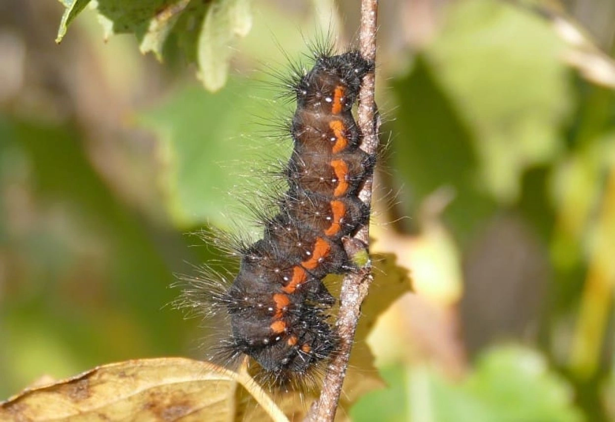 Tot 40 mm; lichaam zwartachtig bruin of zwart met op de rug en flanken zwarte haarborstels; onder de lijn van de spiracula een rij rode vlekjes; spiracula wit; kop en poten glimmend zwart.