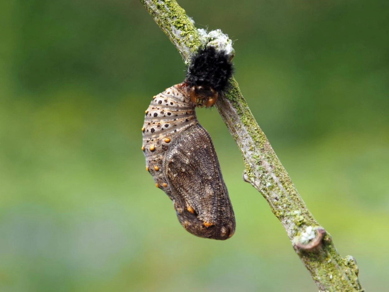 Tot 25 mm; lichaam zwart met dwarse lijnen van witte stippen; korte, zwarte doorns; buikpoten en kop roodachtig bruin.