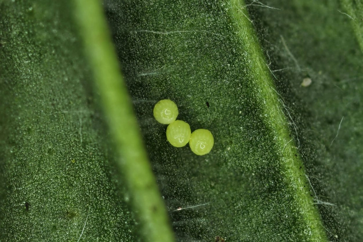 Na de paring zoekt het vrouwtje als afzetplaats voor de eitjes planten die groeien in een open en korte vegetatie, op de warmste plekjes nabij kaal zand of juist in de luwte van hogere planten. De eerste keer zet ze meestal 100 tot 200 eitjes af, het eventuele tweede legsel is kleiner en bestaat uit ongeveer 50 tot 100 eitjes. Het groepje eitjes wordt afgezet op de onderzijde van een liggend blad van een kleine waardplant.