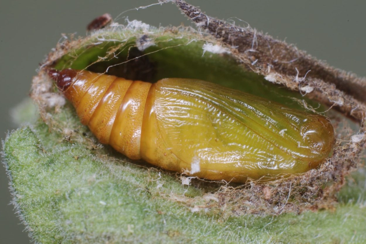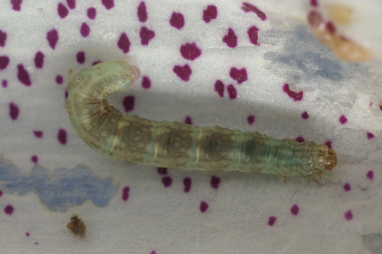 21-22 mm. Lijf meestal groen maar soms bruinachtig met een donkerder ruglijn van variabele breedte, dunnere donkere subdorsale lijnen en gewoonlijk een bruine kop.