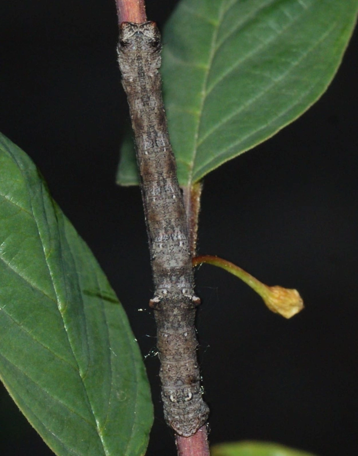Tot 55 mm; lichaam varieert in kleur van grijsachtig bruin tot purperachtig bruin met op de rug twee roodachtig bruine bulten en drie kleinere bulten op de onderzijde; soms een rij donkere, ruitvormige vlekken over het midden van de rug; kop roodachtig bruin, sterk ingesneden.