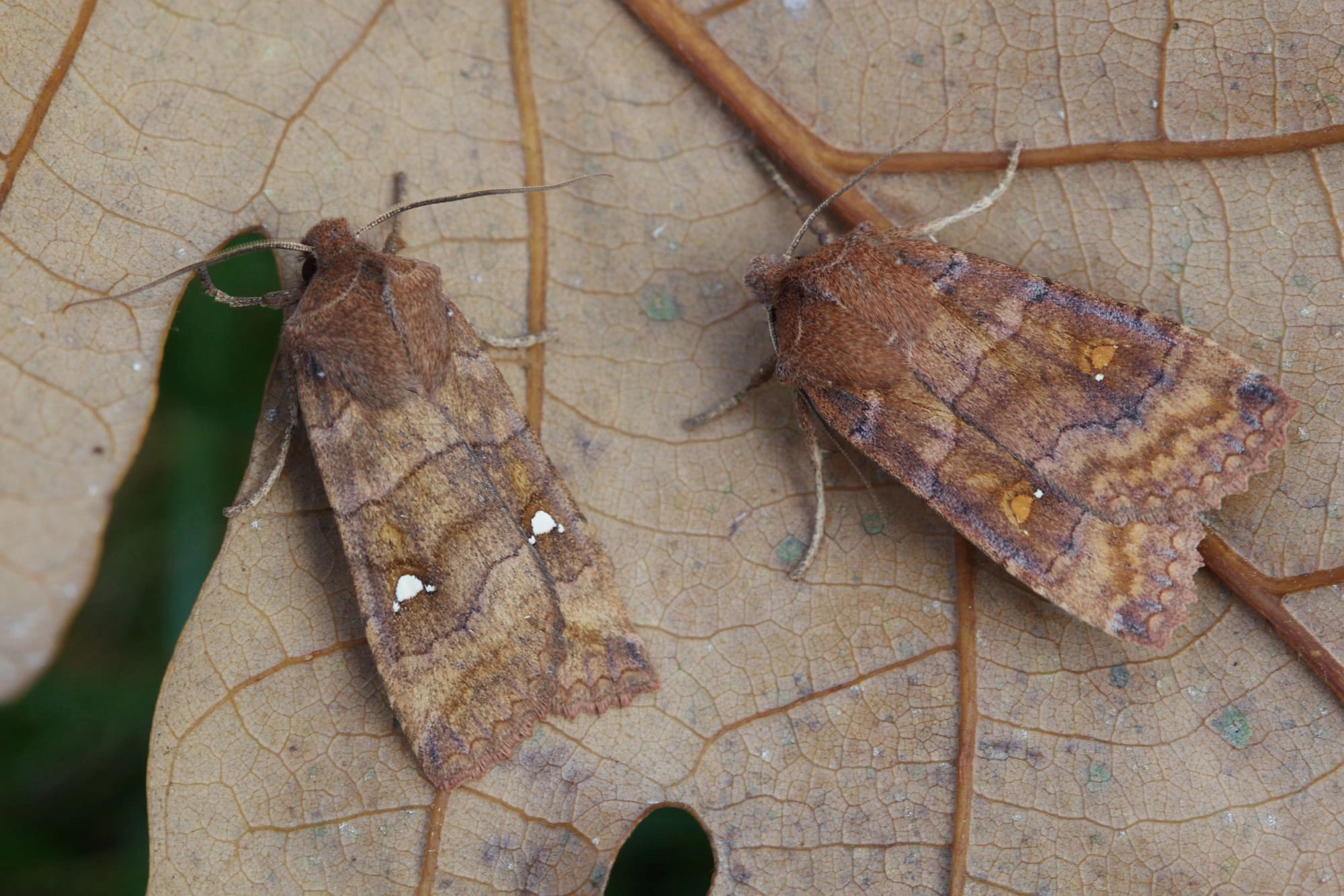 Voorvleugellengte: 17-20 mm. Deze uil is goed te herkennen aan de kleine niervlek op de voorvleugel met aan weerszijden daarvan een klein ‘satellietvlekje’. De kleur van de niervlek varieert van wit tot roomgeel, oranje of oranjebruin. Soms verschillen de vlekjes in kleur van de niervlek of onderling; er zijn ook vlinders waarbij de vlekjes op de op ene vleugel oranje zijn en op de andere vleugel wit. Hoewel de vlekjes soms moeilijk zijn te onderscheiden, zijn ze vrijwel nooit afwezig. De voorvleugel is vrij effen en heeft een warme kaneelbruine, oranjebruine of geelbruine kleur. Verse vlinders hebben soms een blauwachtige of purperachtige glans. Langs de geschulpte achterrand loopt een golvende of zigzaggende franjelijn.