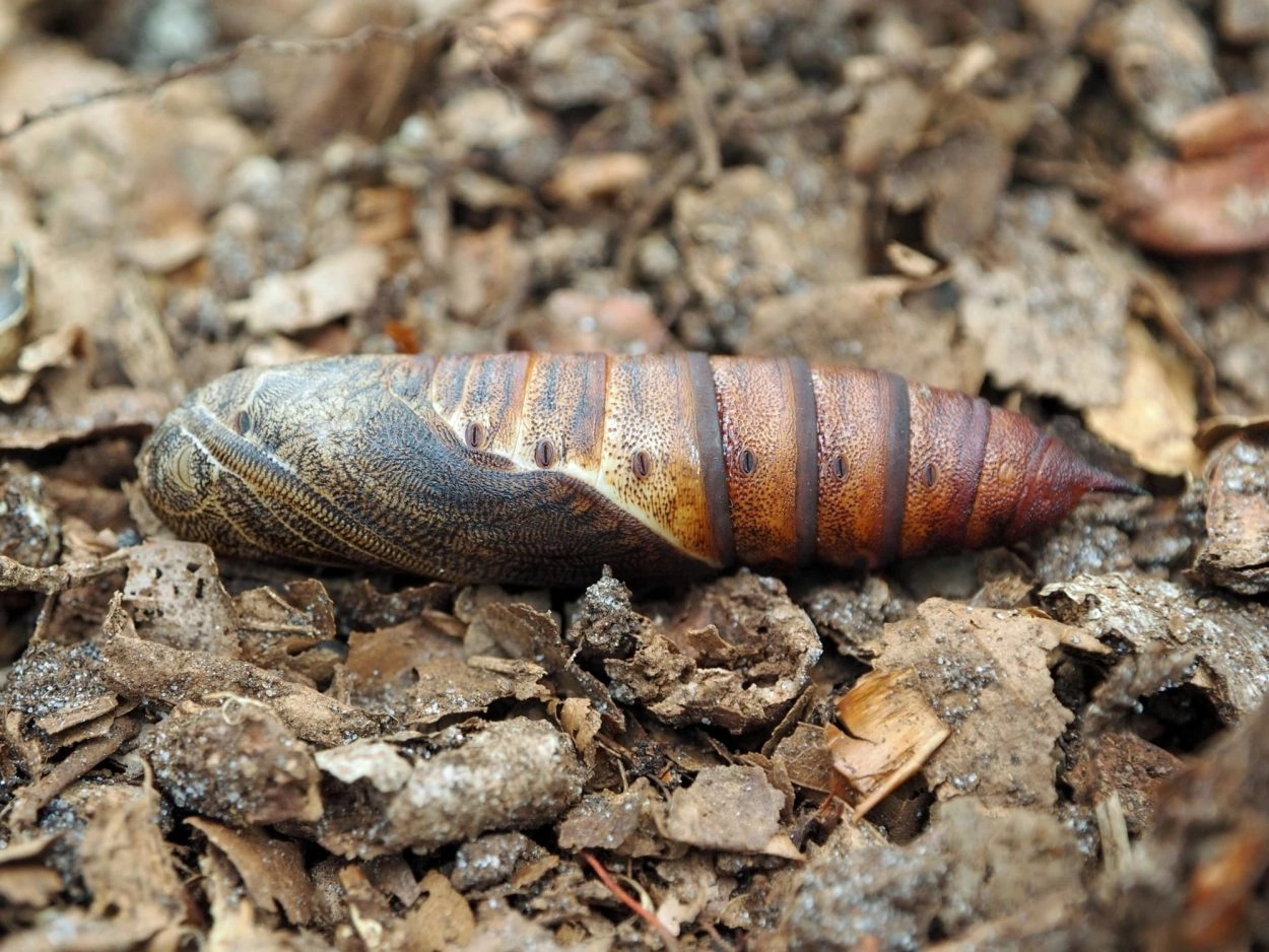 Tot 80 mm; lichaam varieert in kleur van olijfgroen tot bruin of donker purperachtig grijs, besprenkeld met fijne geelachtige vlekjes; op de flanken boven de spiracula een rij grote, ronde, gele of bleek geelachtig bruine vlekken; poten zwart; hoorn op segment elf roodachtig bruin, korrelig en met scherpe punt; kop roze. De jonge rupsen zijn groen