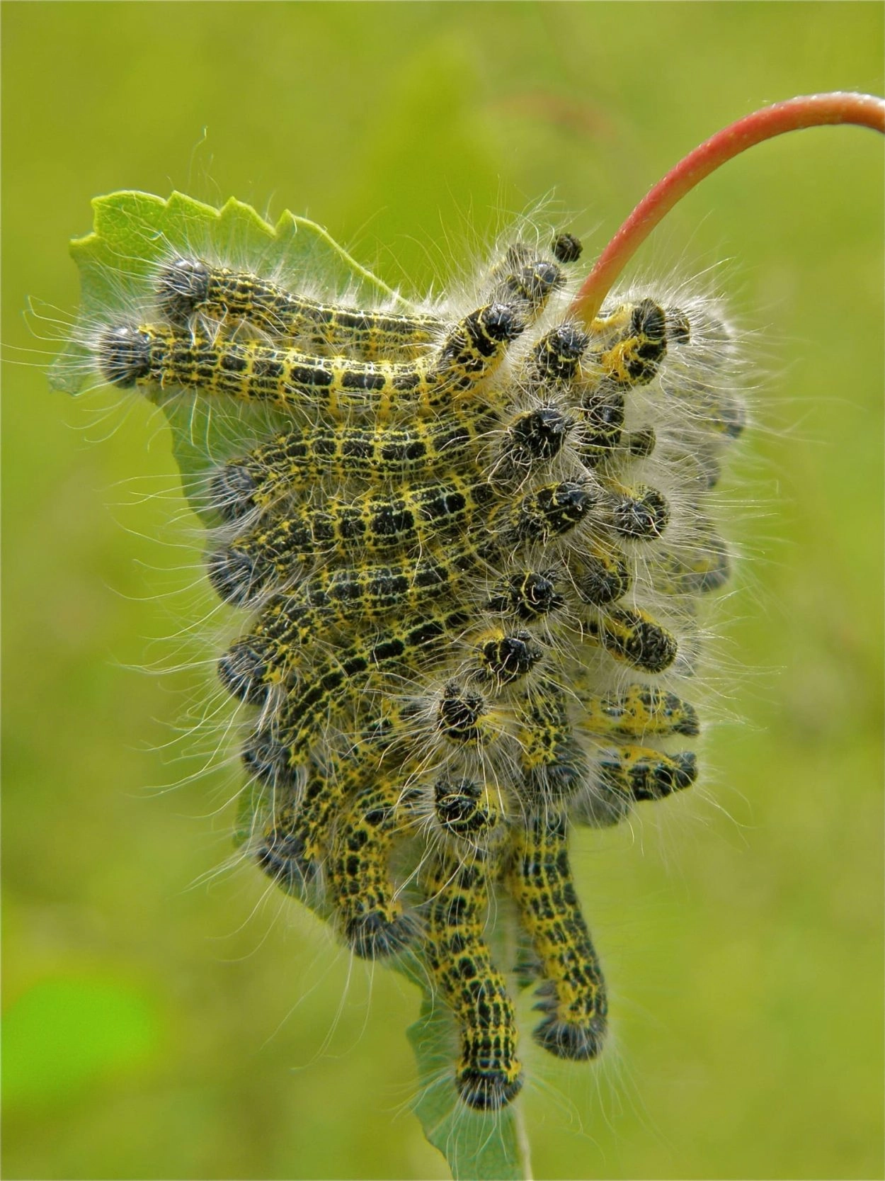 Tot 60 mm; overdekt met fijne wittte haartjes; lichaam glanzend oranje geel met brede zwarte lengtebanden over rug en flanken die door oranje en gele dwarsbanden worden gebroken.; kop zwart met een omgekeerde gele Y.