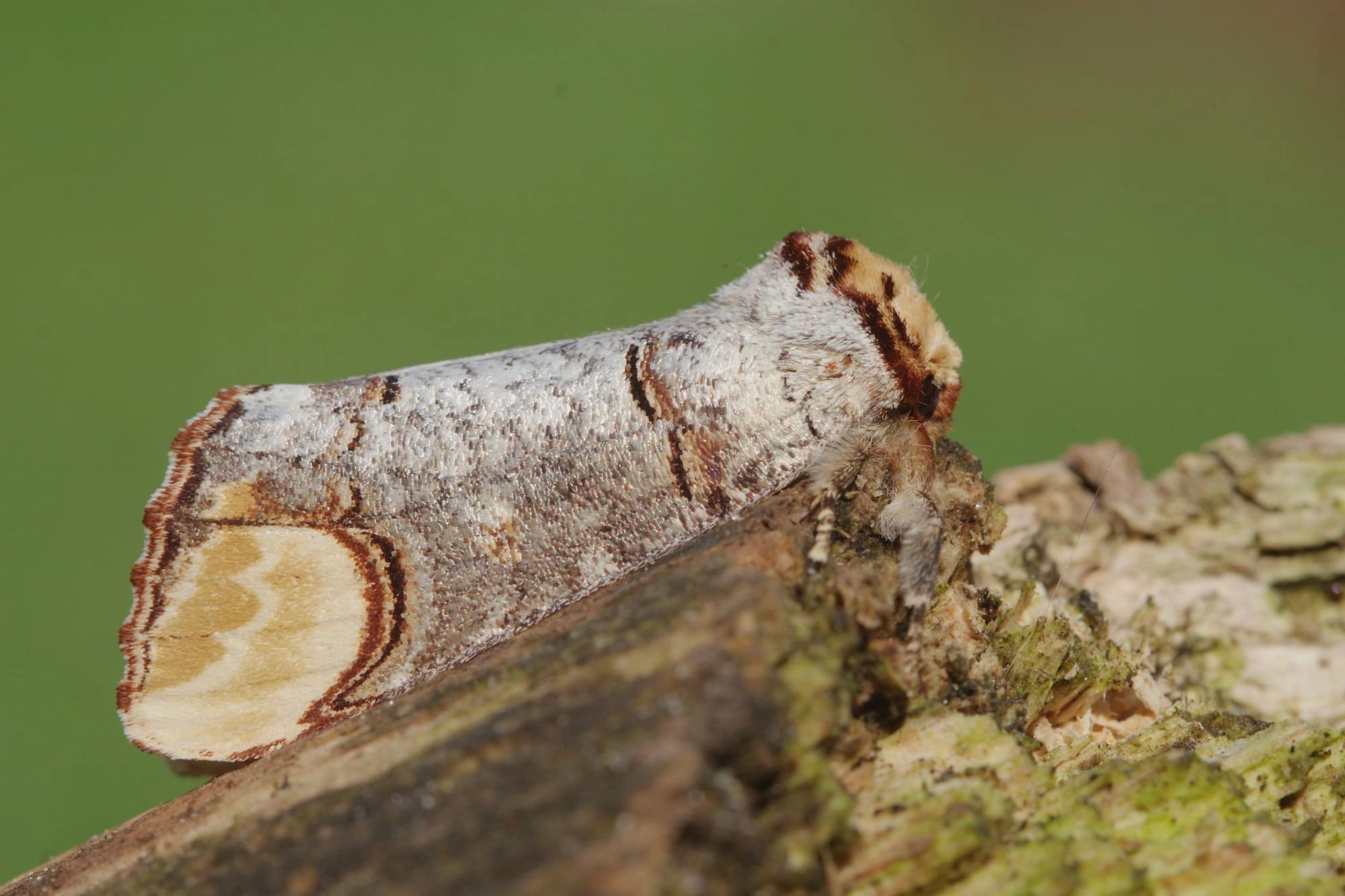 Voorvleugellengte: 22-26 mm. Een goed herkenbare tandvlinder die in rust de vleugels over het achterlijf heen vouwt en op een afgebroken berkentakje lijkt. Dit komt door het bastachtige uiterlijk en de vaalgele ronde vlek op het borststuk en in de vleugelpunt. Er is weinig variatie.