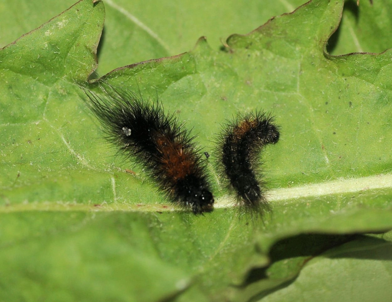 Tot 35 mm; lichaam donker bruinachtig zwart, aan de onderzijde lichter, overdekt met zwartachtige haarborstels, die op verheven, glimmend zwarte wratjes staan ingeplant; de segmenten vier tot zes met roodachtig bruine haarborstels op roodachtig bruine wratjes op de rugzijdde; kop glimmend zwart.