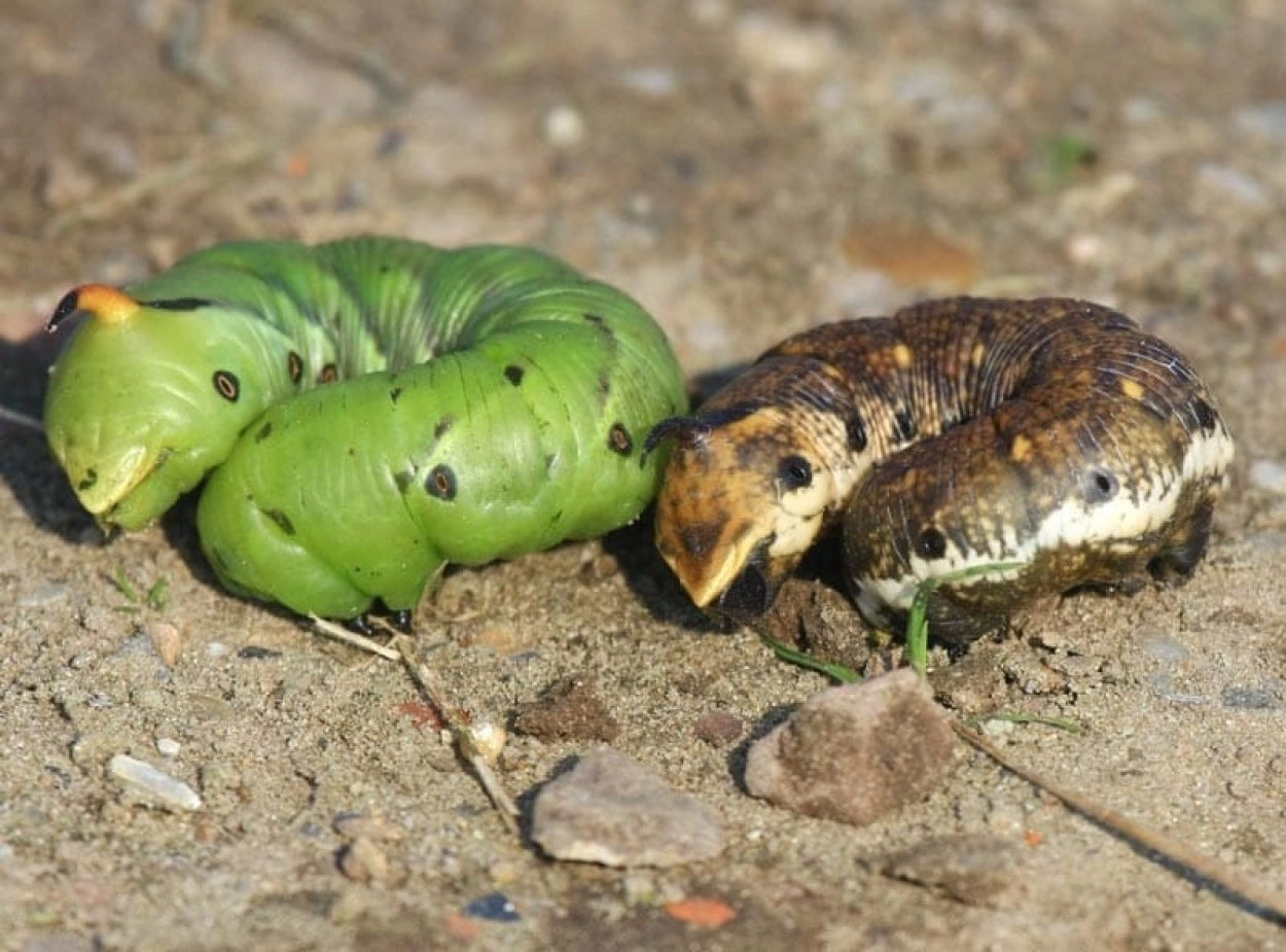 Tot 110 mm; zeer variabel in kleur en tekening, maar kan wel worden verdeeld in groene en bruine vormen; de groene vormen zijn helder groen met bruinachtige of zwartachtige schuine strepen op de flanken boven de spiracula; de bruine vormen hebben een zwartachtig of purperachtig bruin lichaam met lichtbruine of rozeachtige schuine strepen; spiracula zwart; de hoorn op het elfde segment rood of geelachtig met zwart uiteinde; kop roodachtig bruin of licht okerkleurig, met zwarte strepen.