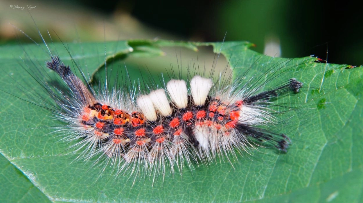 Tot 35 mm; lichaam donkergrijs bedekt met grijsachtig witte haarborstels, die op kleine wratjes staan ingeplant; de segmenten vier tot zeven elk met een opvallende bruine, gele of licht okerkleurige haarborstel op het midden van de rug; segment een met een paar naar voren wijzende borstels van lange zwarte gepluimde haren en segment elf met een identieke haarborstel, die op het midden van de rug staat en naar achteren wijst; over de rug vier rijen vuilrode vlekken en over de flanken een gebroken witte lengtestreep over de spiracula; kop glimmend zwart. De haren kunnen een jeukende uitslag veroorzaken.
