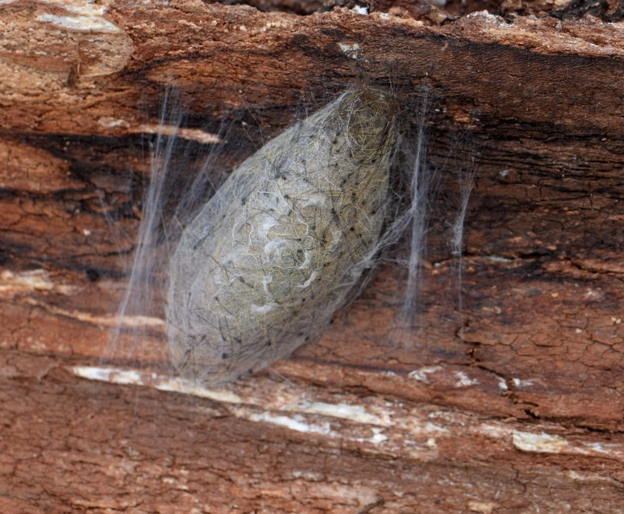 Rups: mei-september. De soort overwintert als ei in legsels van enkele honderden eieren op de buitenzijde van de lege, aan de waardplant vastgehechte cocon van het vrouwtje of op een nabij gelegen hek of muur. De eieren van één legsel komen soms verspreid over een langere periode uit. Een enkele keer overwintert een late, niet uitgekomen pop.