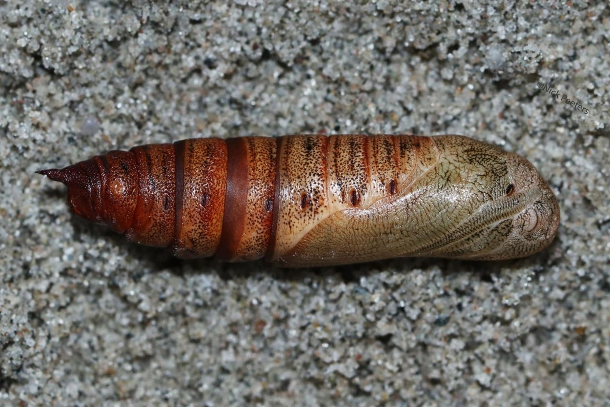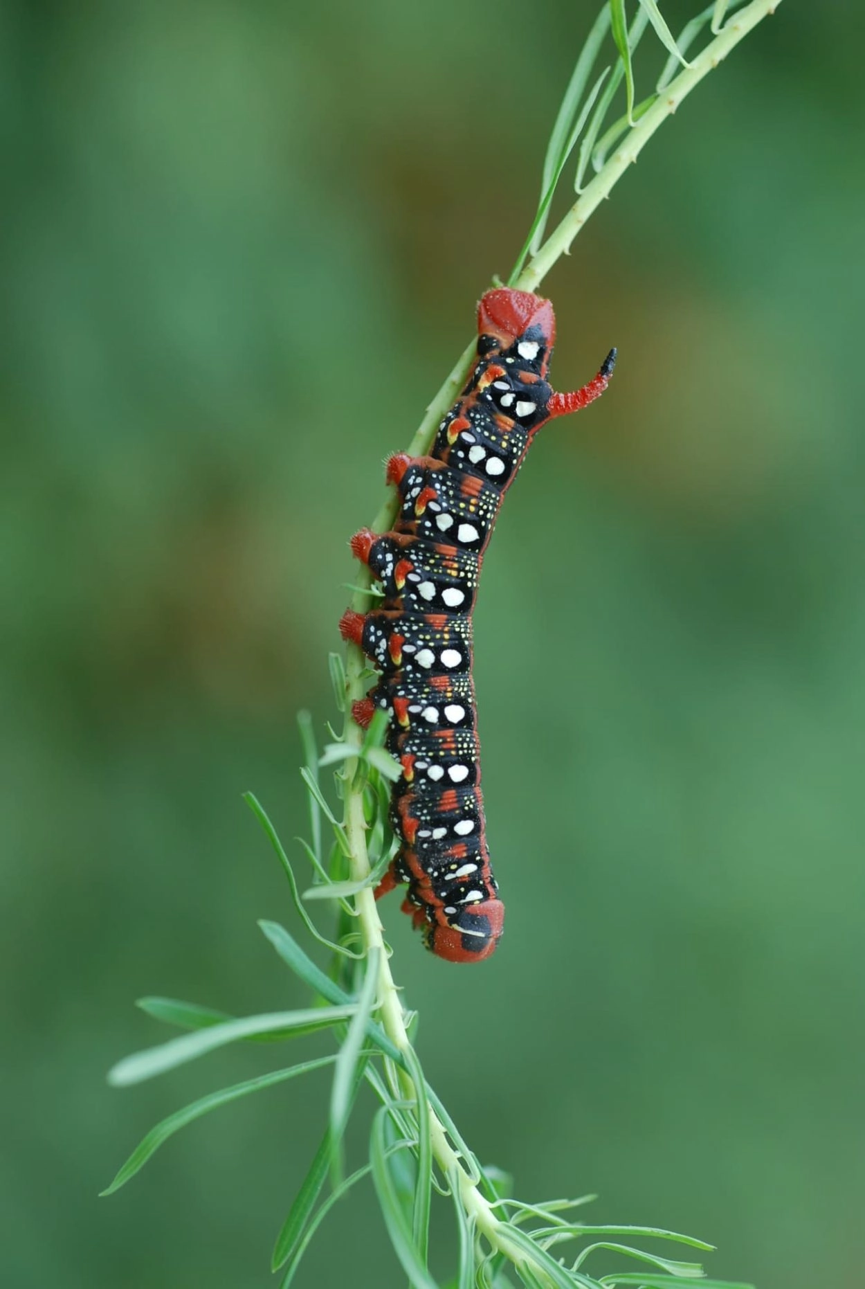 Tot 80 mm; lichaam zwart, fijn geel gespikkeld; overde rug een brede, rode lengtestreep; rug en flanken variabel met rode en gele vlekken getekend; onder de spiracula een brede, rode lengteband; hoorn op segment elf rood met zwart uiteinde; kop rood.