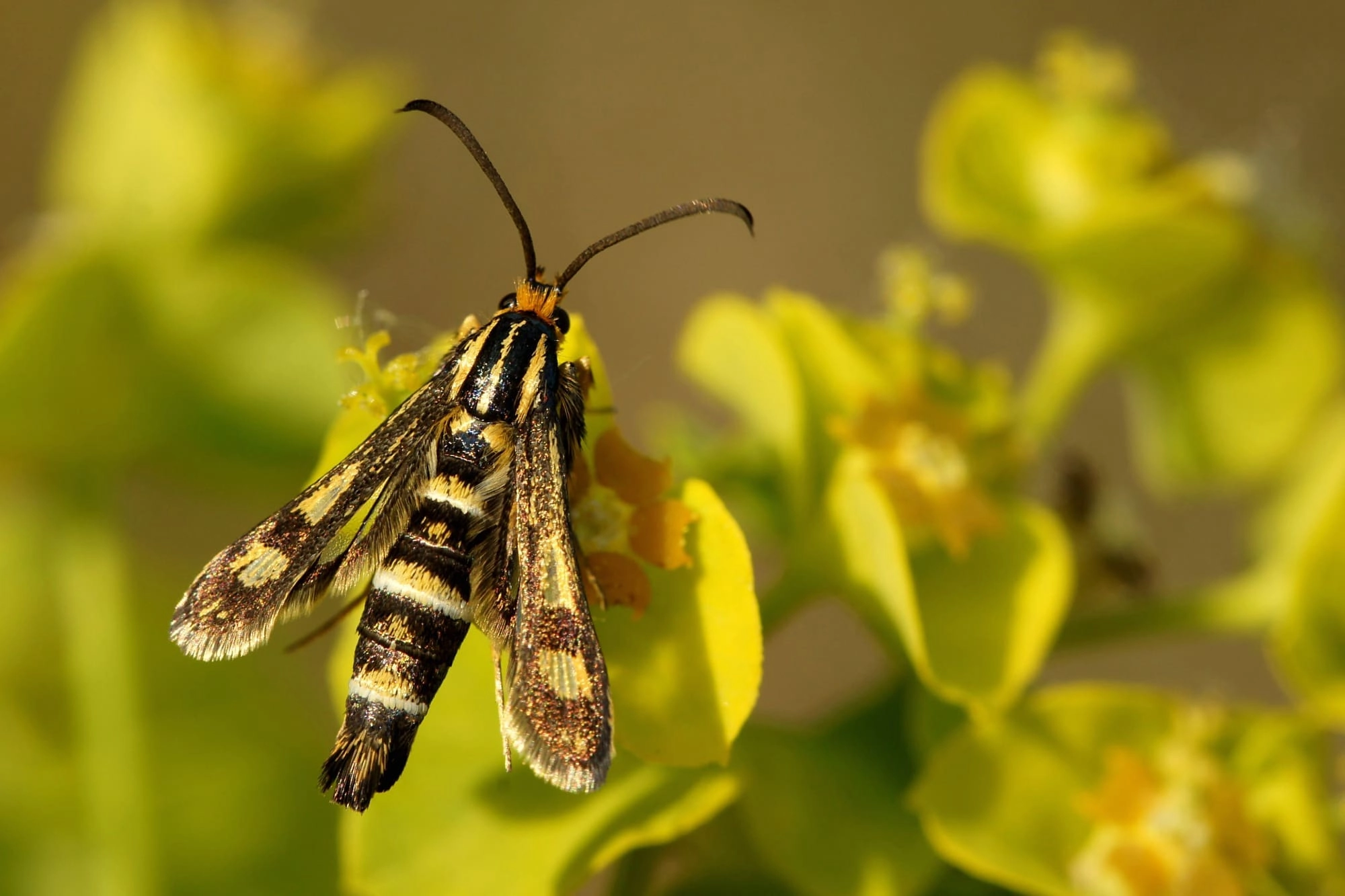 Voorvleugellengte: 6-10 mm. In het midden van het donkere veld in de vleugelpunt van de voorvleugel ligt een goudgele vlek. De achterste cel in de vleugelwortel reikt niet tot aan het donkere middenveld, wat een kenmerk is van alle soorten uit het geslacht Chamaesphecia. Op het achterlijf bevinden zich enkele goudgele tot witachtig gele dwarsbandjes. Het pluimpje aan het uiteinde van het achterlijf is donker met enkele plukjes gele haren (drie bij het mannetje en twee bij het vrouwtje).