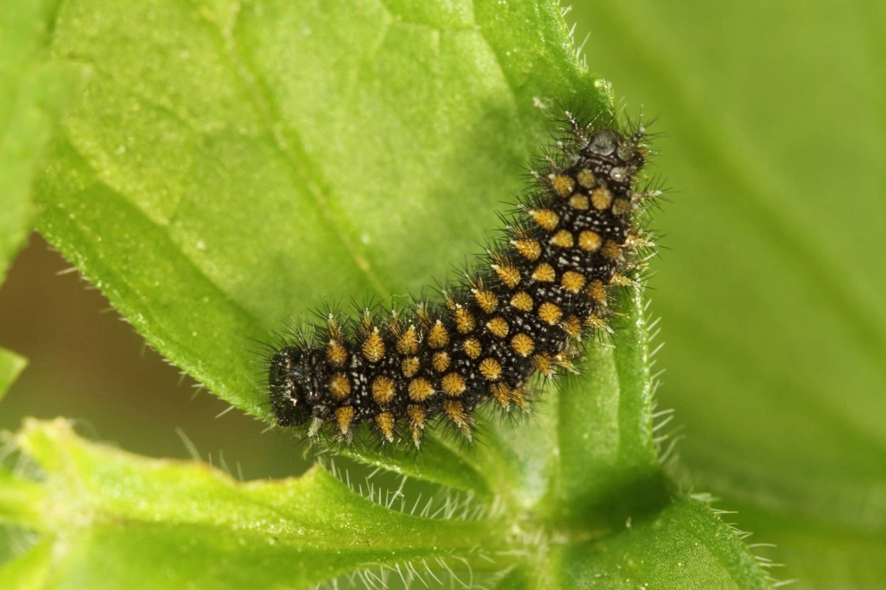 Tot 35 mm; lichaam donker grijsachtig bruin met oranje-gele doorns; kop zwartachtig bruin.