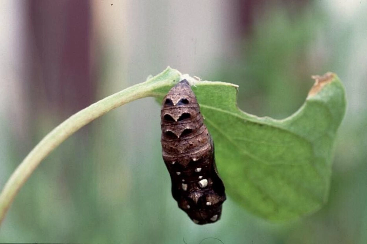 Tot 22 mm; lichaam roze-achtig bruin met zwarte tekening en zeer fijn wit gespikkeld; doorns roze-achtig geel met fijne, zwarte haartjes; het eerste paar doorns achter de kop is aanmerkelijk langer en lijkt op een paar hoorntjes; kop zwart.