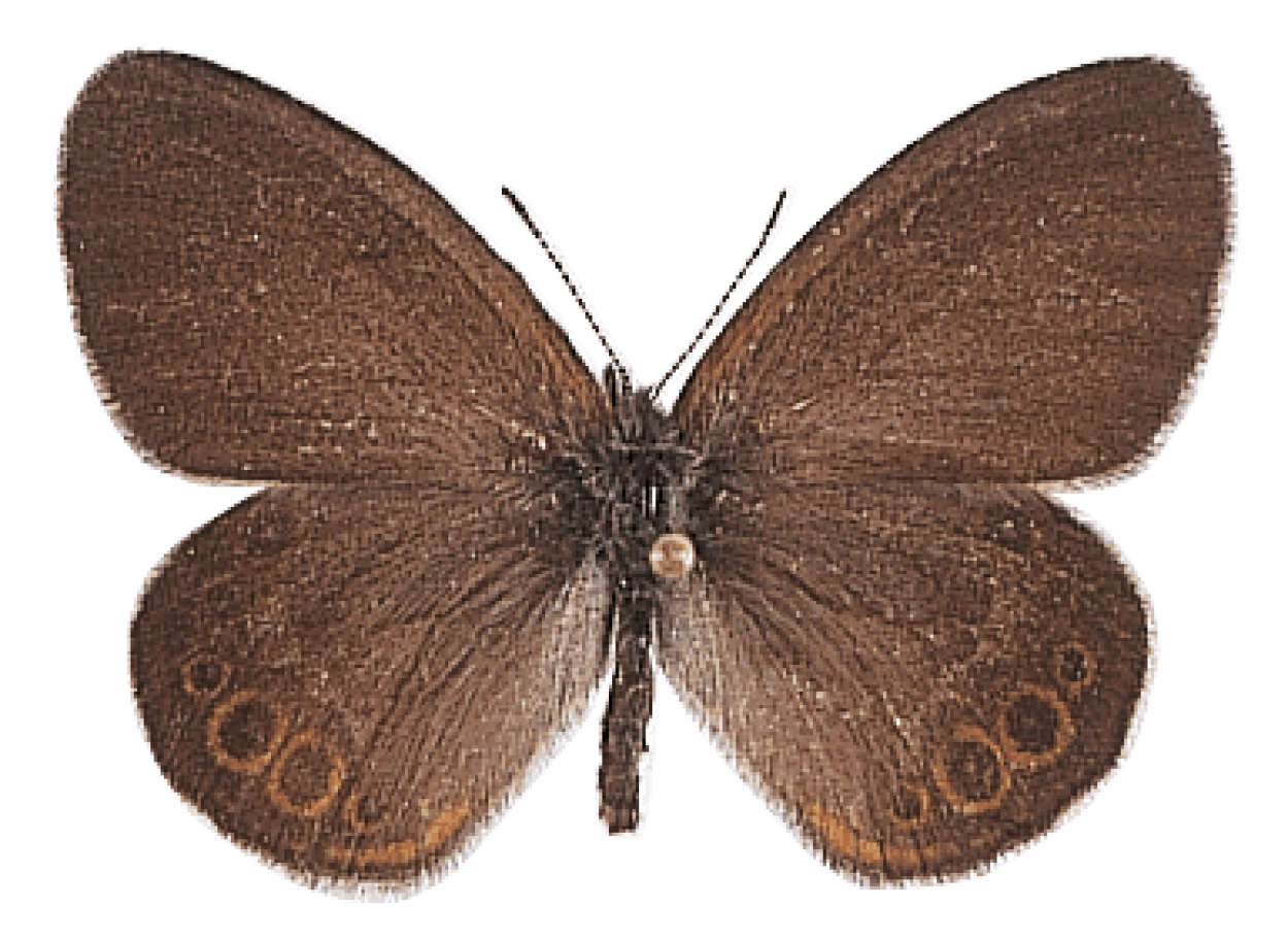 Voorvleugellengte: circa 17 mm. De bovenkant van de voorvleugel is donkerbruin; bij het vrouwtje liggen twee kleine oranje vlekjes langs de achterrand. Op de bovenkant van de achtervleugel staan vier zwarte, oranjegerande oogvlekjes, die bij het mannetje soms slecht ontwikkeld zijn. Op de onderkant van de achtervleugel bevindt zich een doorgaande rij oogvlekken die aan de buitenkant door een zilverkleurige streep is afgegrensd en aan de binnenkant loopt een smalle witte band die net zo lang is als de rij oogvlekken.