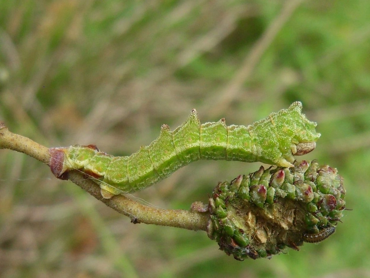 Tot 29 mm; lichaam met ruwe huid, geelachtig groen met een weerszijden van de rug een rij grote roodachtig bruine wratten; kop ingesneden, groen met roodachtig bruine tint. De jonge rupsjes zijn bruin, maar worden na de overwintering groen.