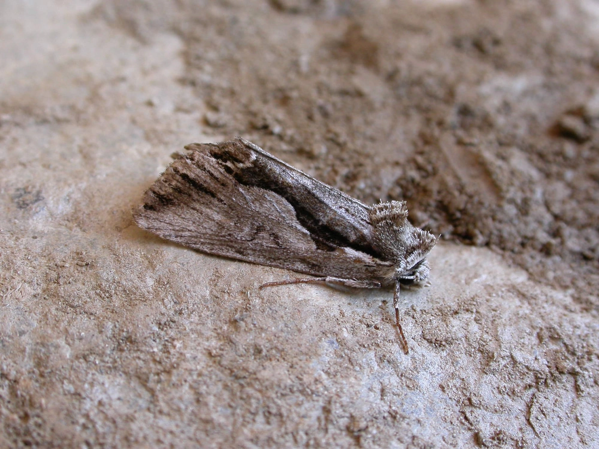 Voorvleugellengte: 14-16mm. De grondkleur van de voorvleugel van deze uil is grijsachtig bruin. Opvallend is de donkerbruine zone langs de binnenrand, die in het midden van de vleugelrand breed is, daarna weer smaller wordt en vervolgens schuin richting de vleugelpunt doorloopt. In de binnenrandhoek bevindt zich een opvallende, door de golflijn wit omrande vlek.