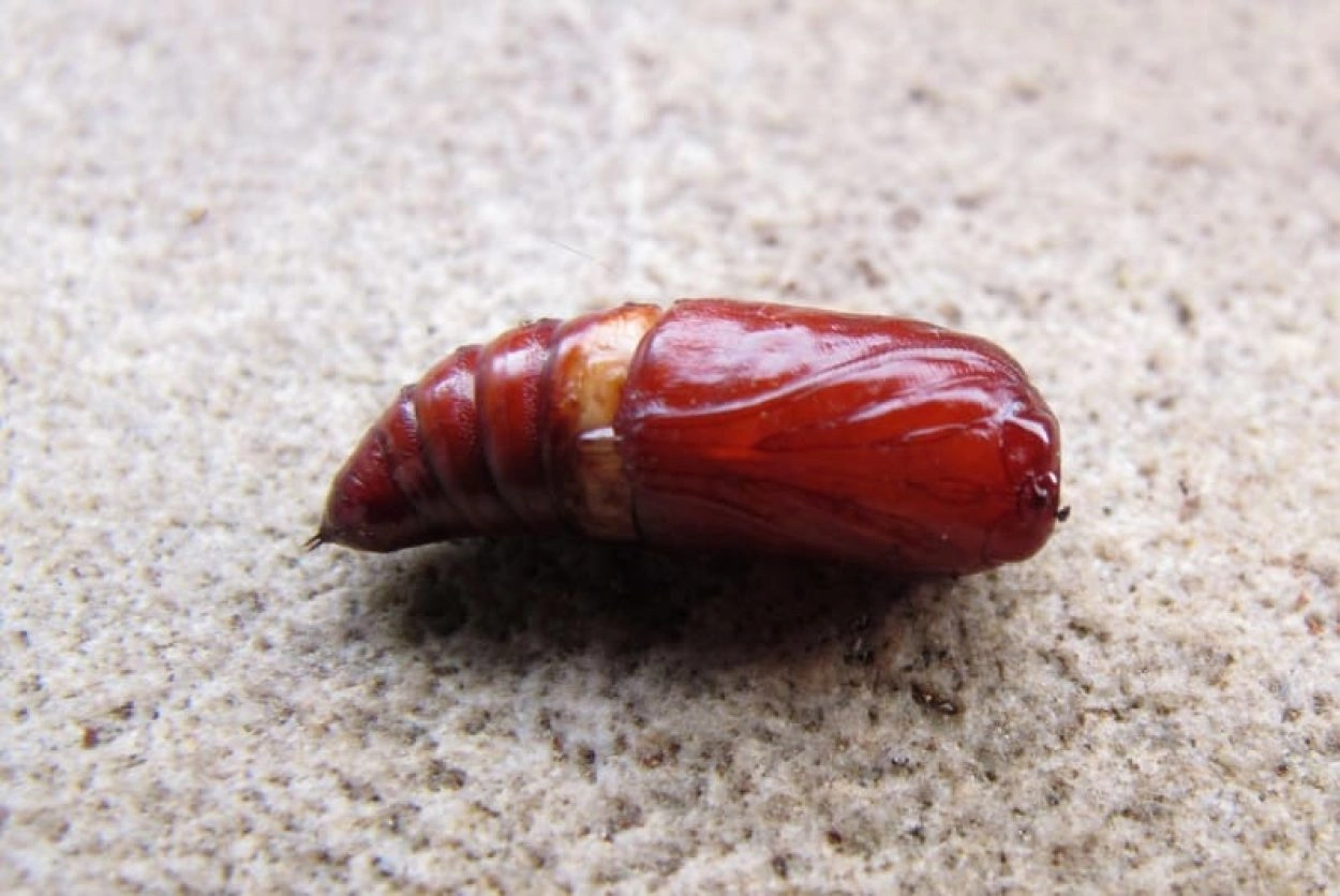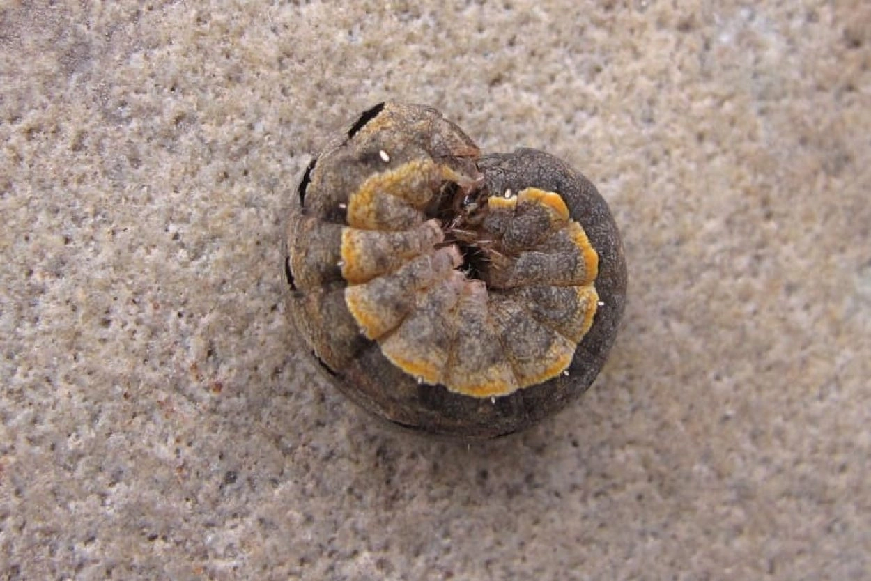Tot 37 mm; lichaam grijsachtig bruin; over de rug een dubbele rij zwarte, wigvormige balken, die naar de staart toe groter worden en beneden de lijn van de spiracula een geelachtige lengteband; kop lichtbruin met donkerder bruine banden.