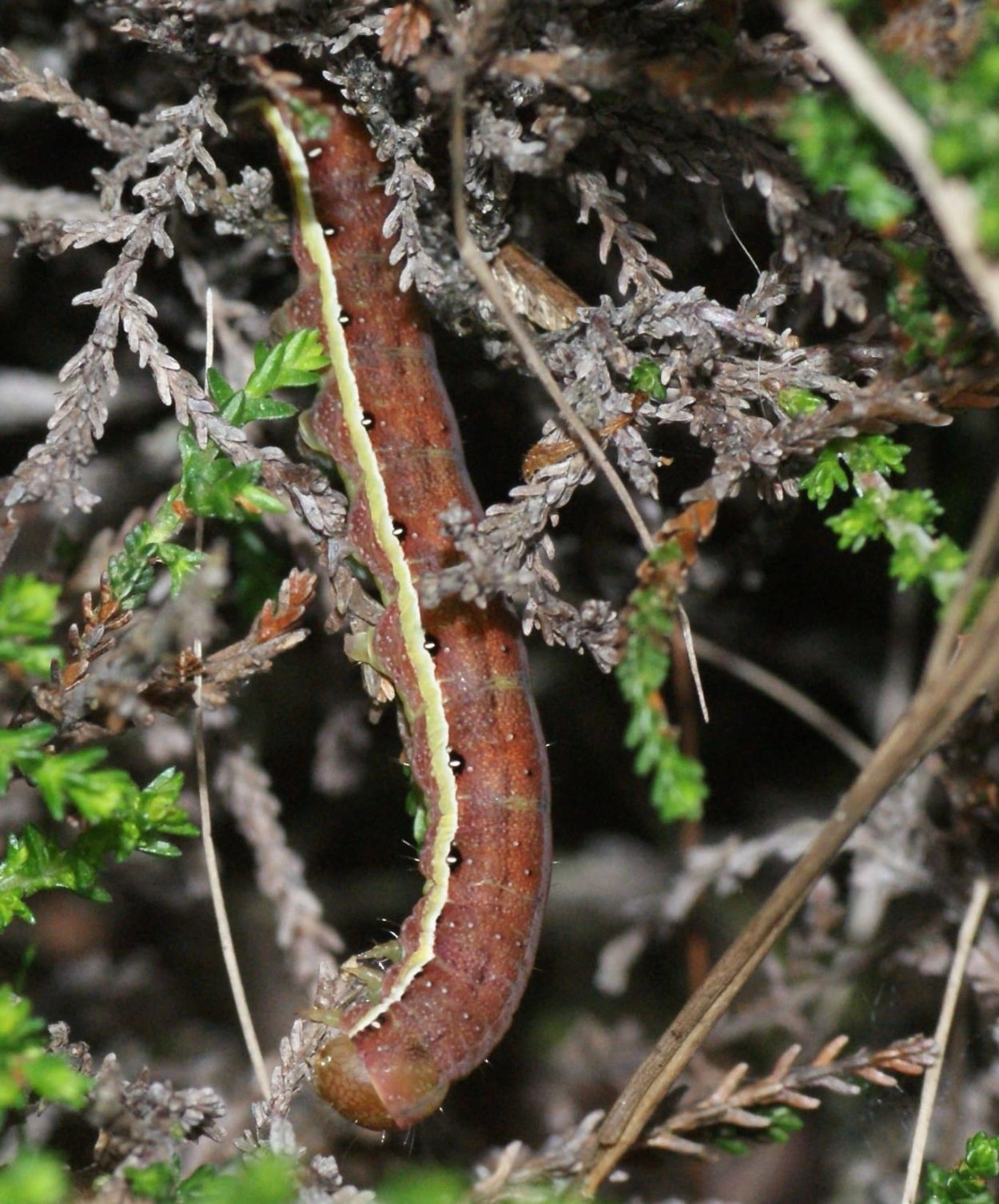 Tot 50 mm; slank; lichaam zeer variabel in kleur van groen tot roodachtig bruin, roze of grijs; over het midden van de rug een rij donkere pijlvlekken met aan weerszijden een donkere lengtestreep; over de zwartgerande spiracula een witte lengtestreep met daaronder een geelachtig groene lengteband; de groene vormen hebben vaak een bruine zweem en bruine tekening; kop bruin of bruinachtig groen.