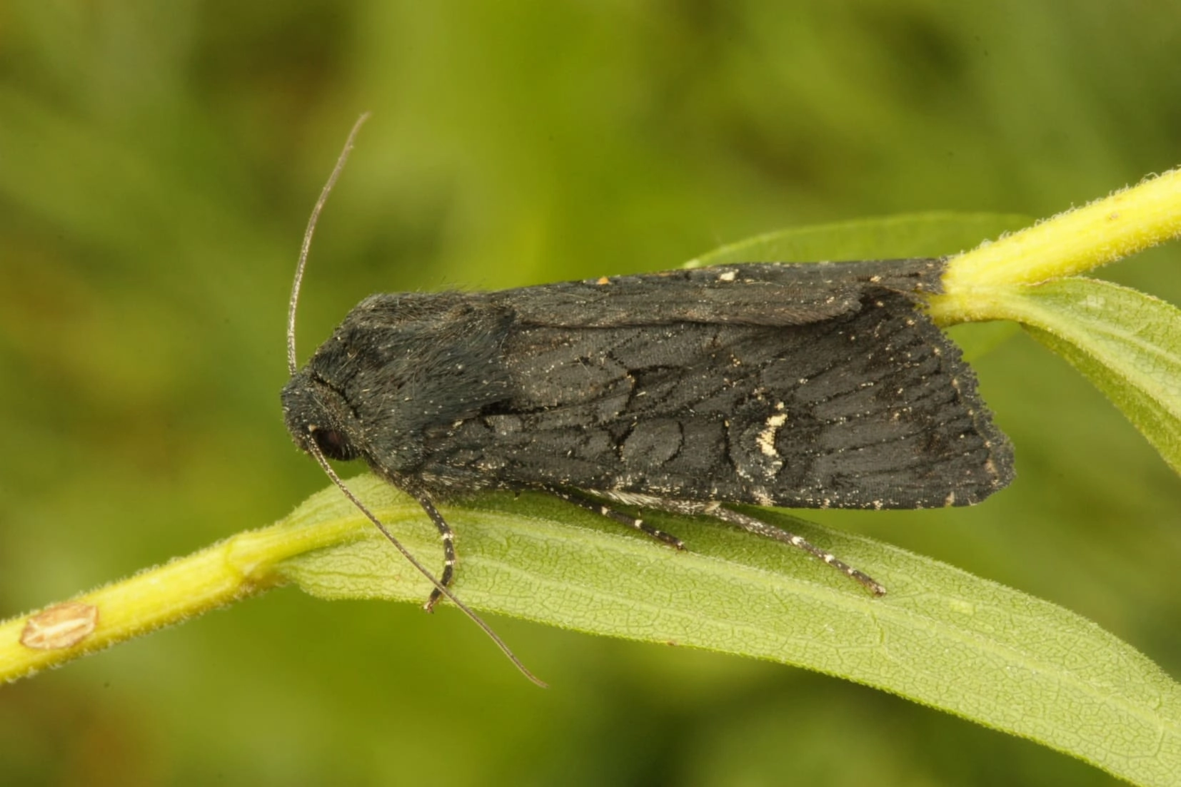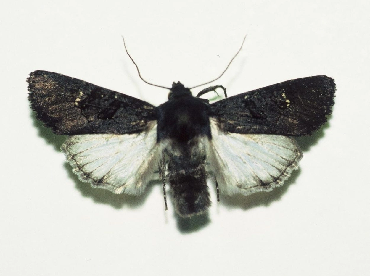 Voorvleugellengte: 17-21 mm. Op de glanzend zwartachtig donkerbruine of zwarte voorvleugel vallen de dwarslijnen en de uilvlekken nauwelijks op. Het enige in het oog springende kenmerk is de wit- of geelachtige achterrand van de niervlek. In het zoomveld bevinden zich enkele lichte vlekjes langs de voorrand. Het mannetje heeft een witte achtervleugel met een smalle donkere streep langs de achterrand; het vrouwtje heeft een grijze achtervleugel met een lichtere vleugelwortel.