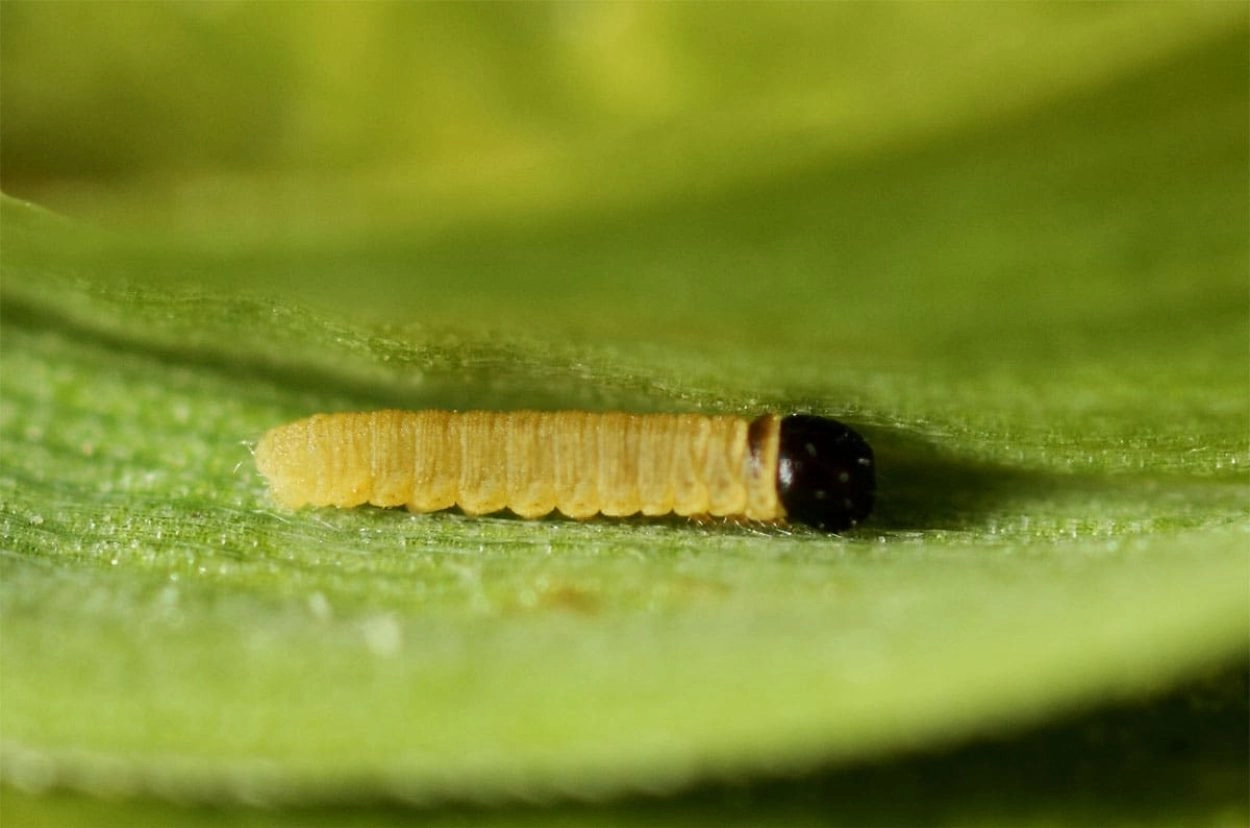 In april komt de rups uit en spint meteen een kokertje van een blad. Vanuit dat kokertje voedt de rups zich met malse grassprieten. In juni spint de rups een cocon van bladeren, meestal aan de basis van de waardplant waarin de verpopping plaatsvindt.