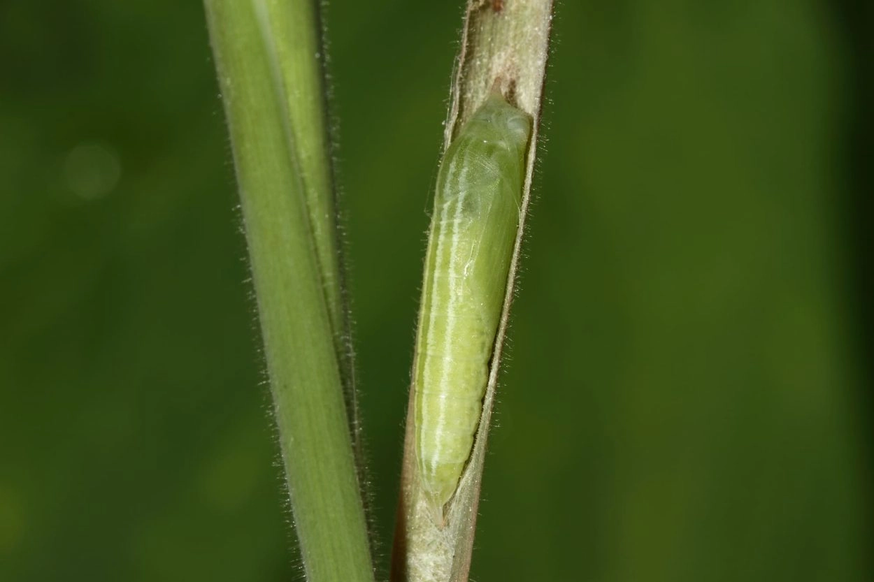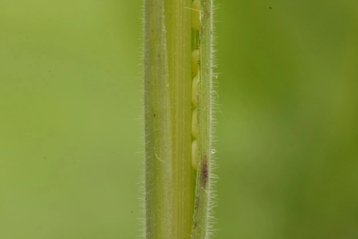 Bij het afzetten van de eitjes oriënteert het vrouwtje zich op de niet beschaduwde delen van ruigten. Zodra zij op een geschikte waardplant (een breedbladige grassoort) is geland, loopt ze langs de stengel naar beneden. Vervolgens gaat ze weer langzaam naar boven, waarbij het achterlijf op vijftien tot twintig centimeter van de grond in de bladschede van een dorre stengel wordt gestoken. Daarin worden de platte, witte eitjes in strengen van vier of vijf afgezet, waar ze ook overwinteren. Ook kan het voorkomen dat eitjes tussen de (verdorde) bloeiwijze worden gelegd. Als een eitje valt kan het ook in de strooisellaag overwinteren.