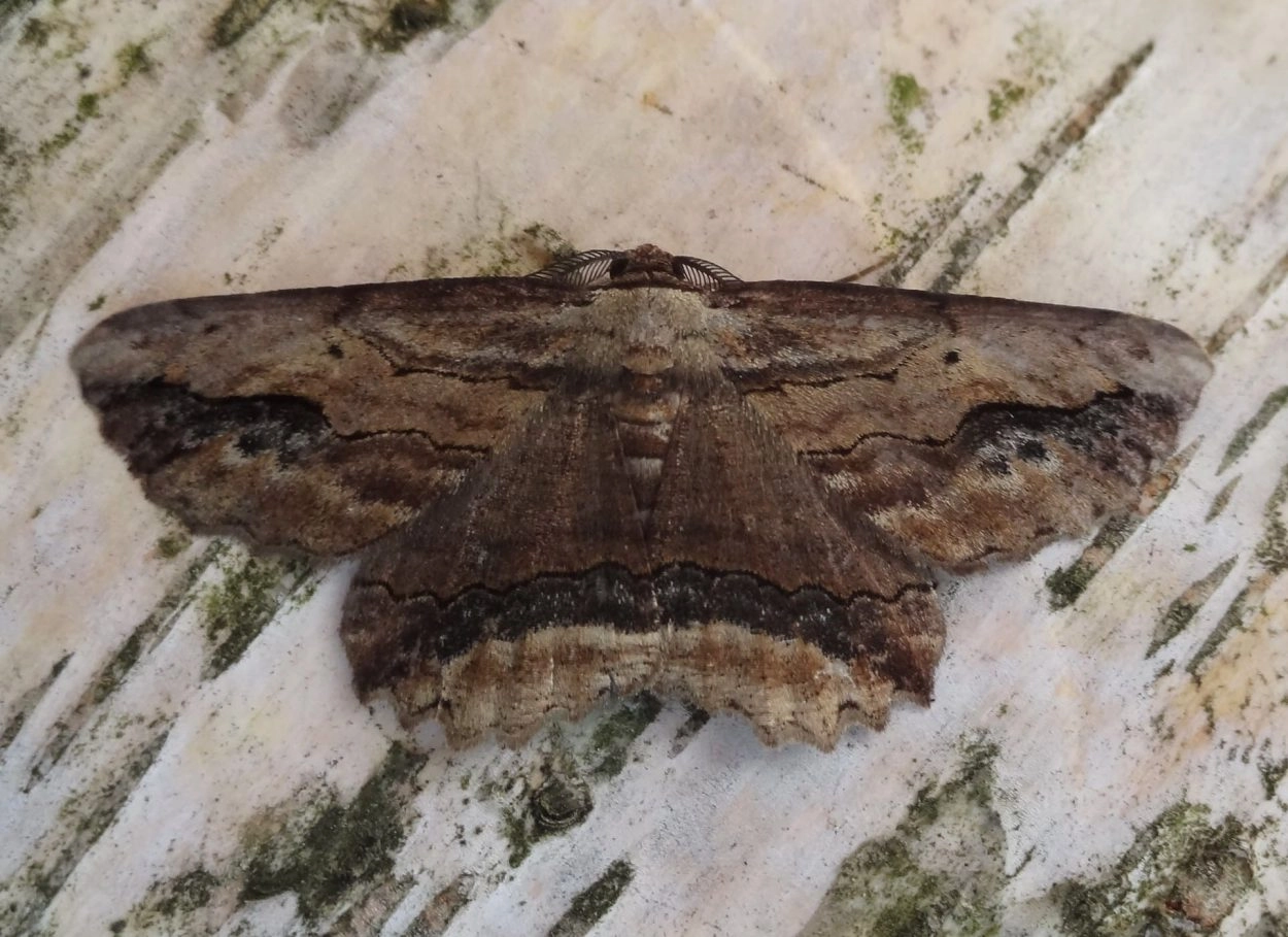 Tot 40 mm; lichaam grijsachtig bruin, soms met een groene zweem of bijna volkomen zwart; over de rug rozeachtig of purperachtig bruine vlekjes en donkere strepen en banden; op de rug ook drie kleine, zwartgerande bultjes; kop grijsachtig bruin, diep ingesneden.