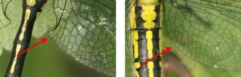 Mannetjes uit de familie van de rombouten onderscheiden zich van de vrouwtjes door de gehoekte achtervleugelbasis. Bij de vrouwtjes is de achtervleugel aan de basis afgerond. Dit geldt ook voor alle glanslibellen en sommige glazenmakers.