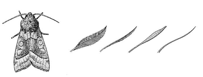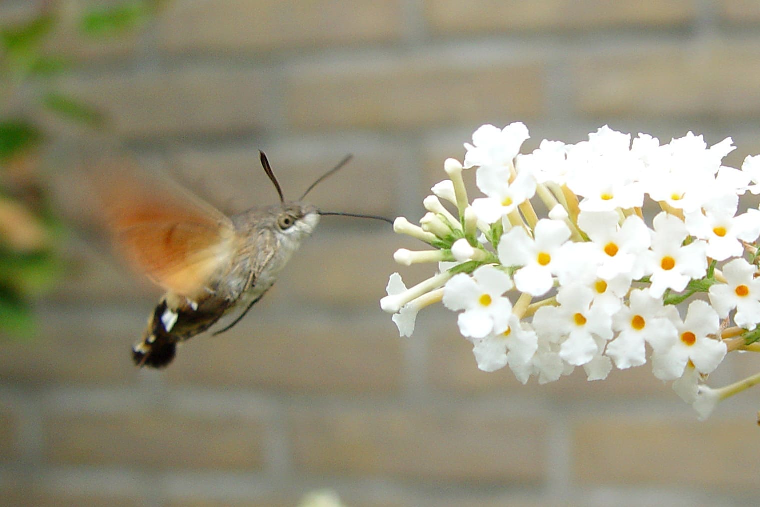 De voelsprieten van de kolibrievlinder zijn draadvormig en hebben geen knopje: dit is een nachtvlinder