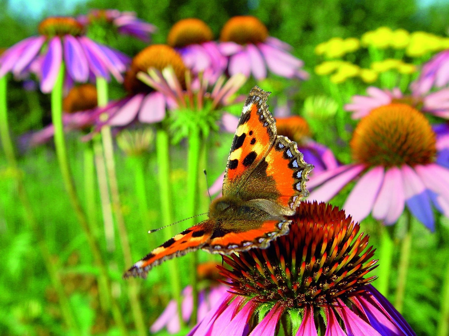 Kleine vos op zonnehoed (Echinacea Purpurea).