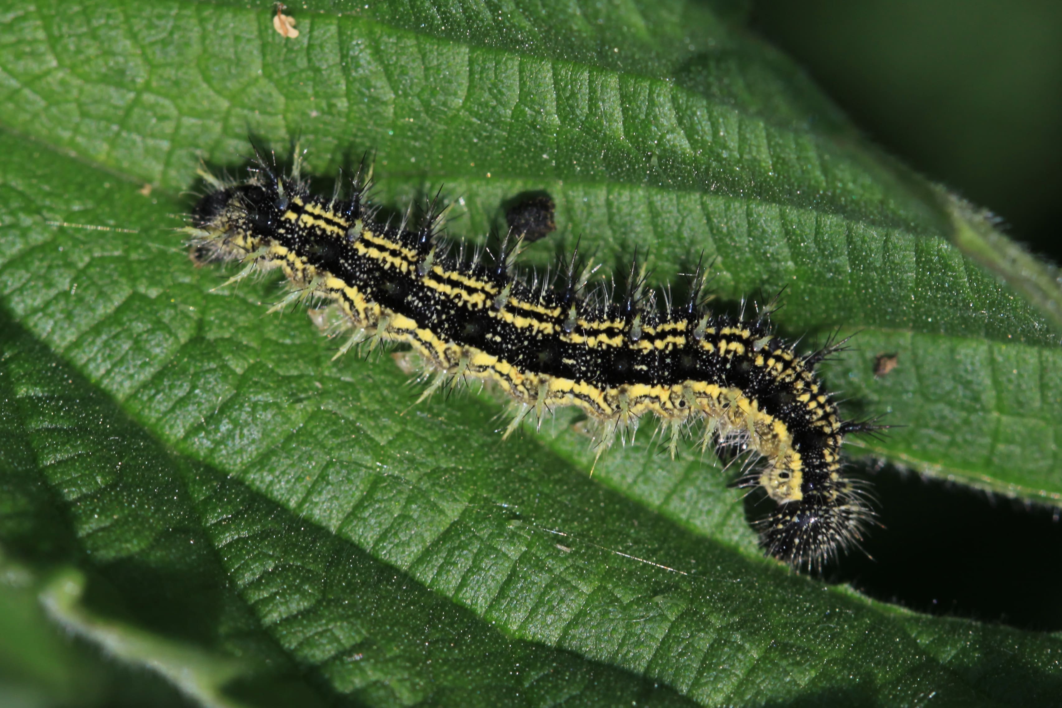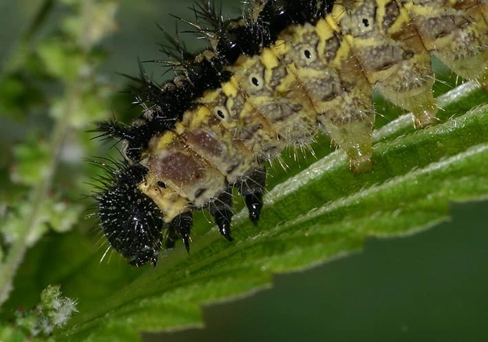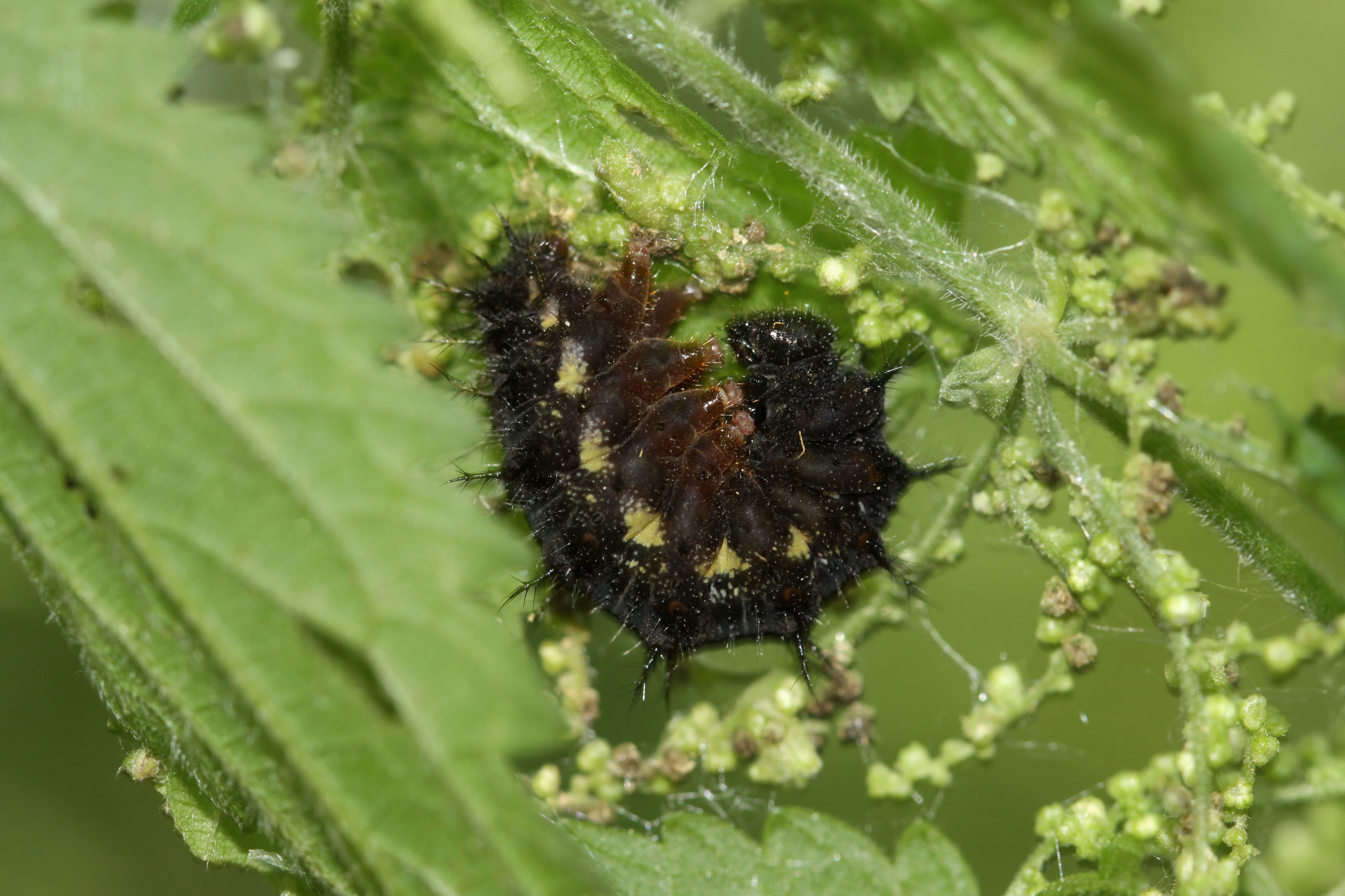 De rupsen zijn zwart gekleurd met witte stippen. De tekening van witte stippen verdicht zich op de bovenzijde niet tot een dubbele lengtestreep (vergelijk met kleine vos en distelvlinder).