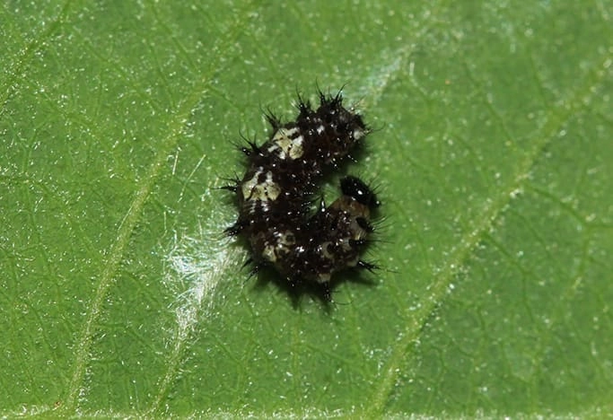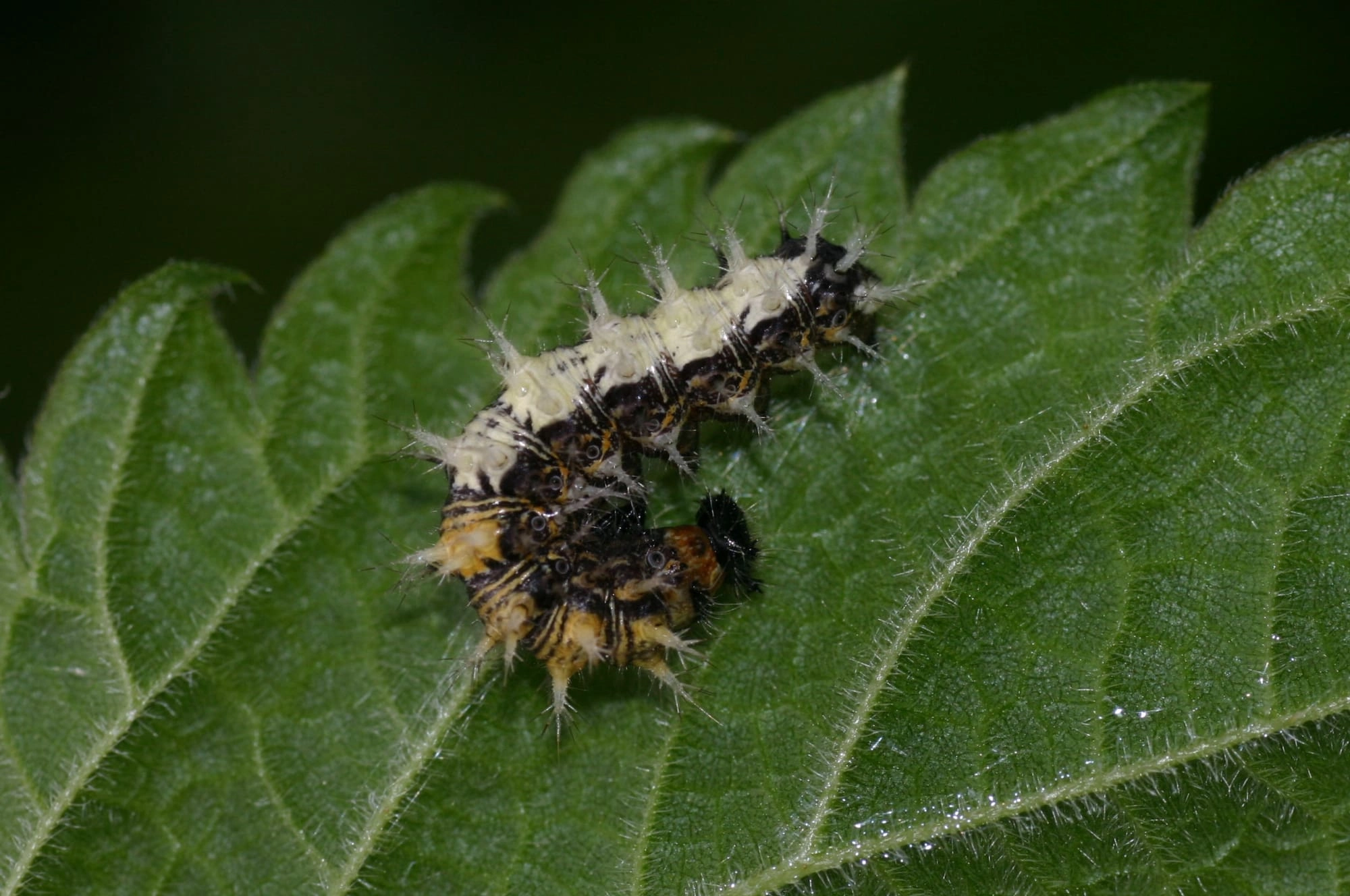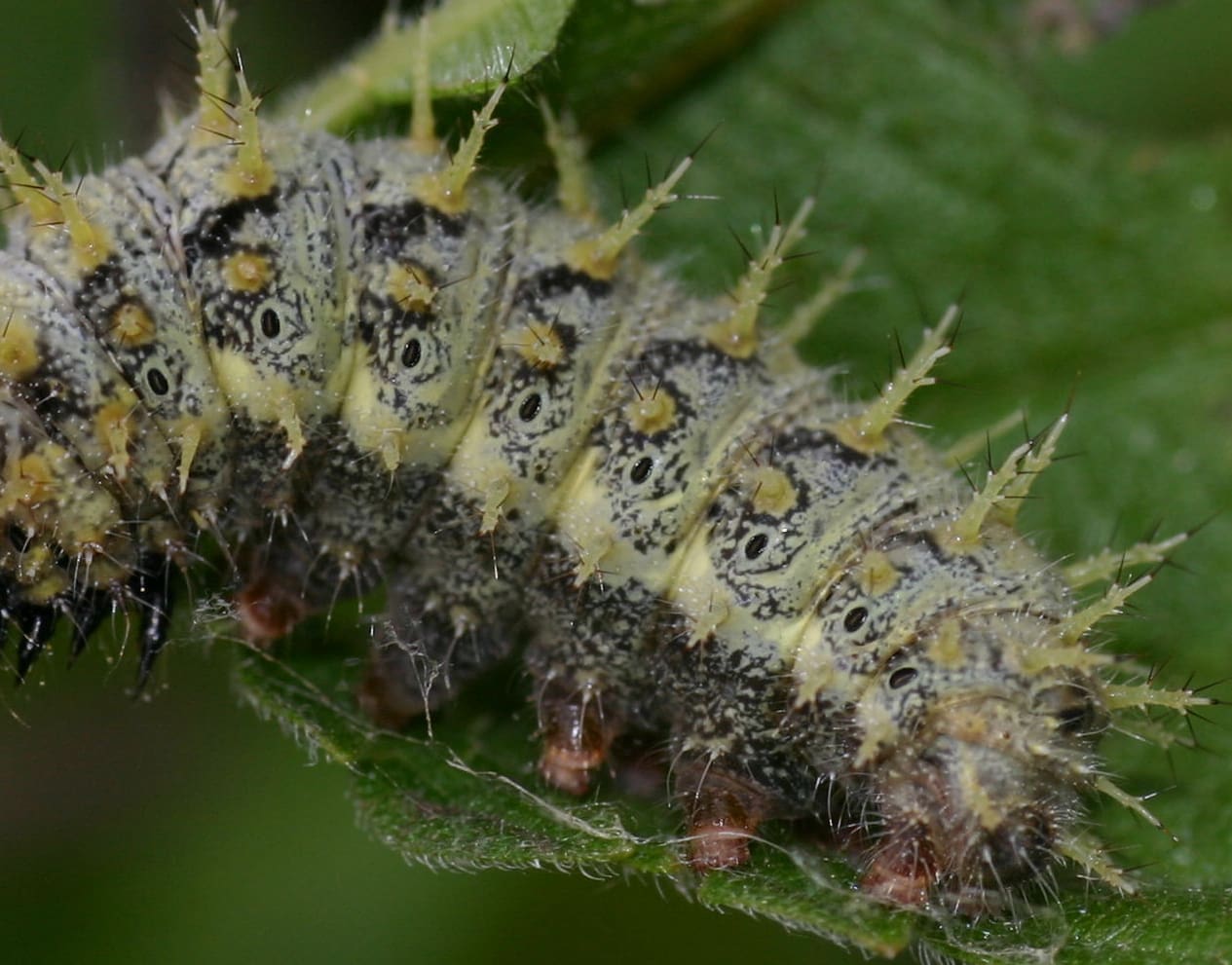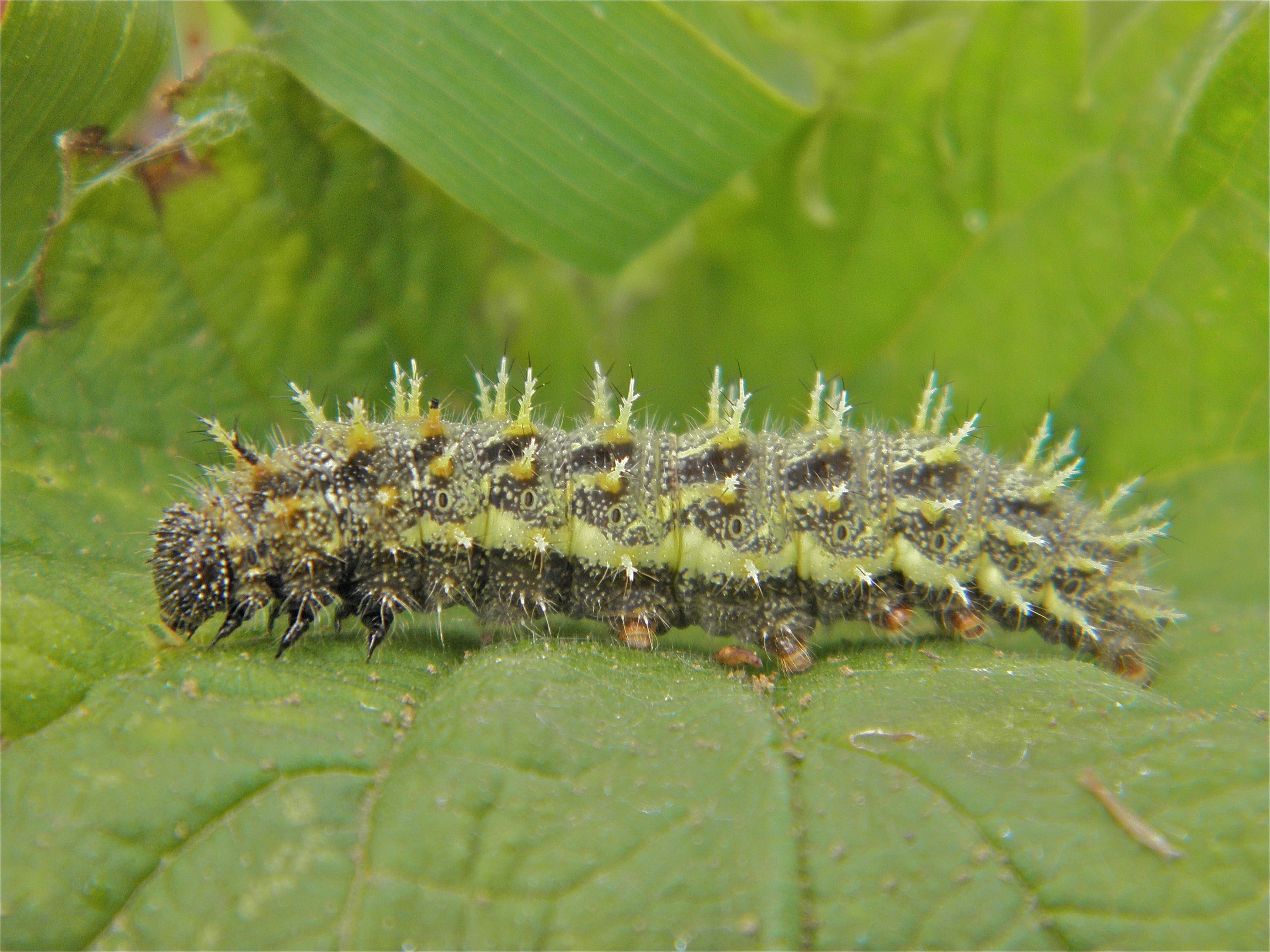 De rupsen zijn zwart gekleurd met witte stippen. De tekening van witte stippen verdicht zich op de bovenzijde niet tot een dubbele lengtestreep (vergelijk met kleine vos en distelvlinder).