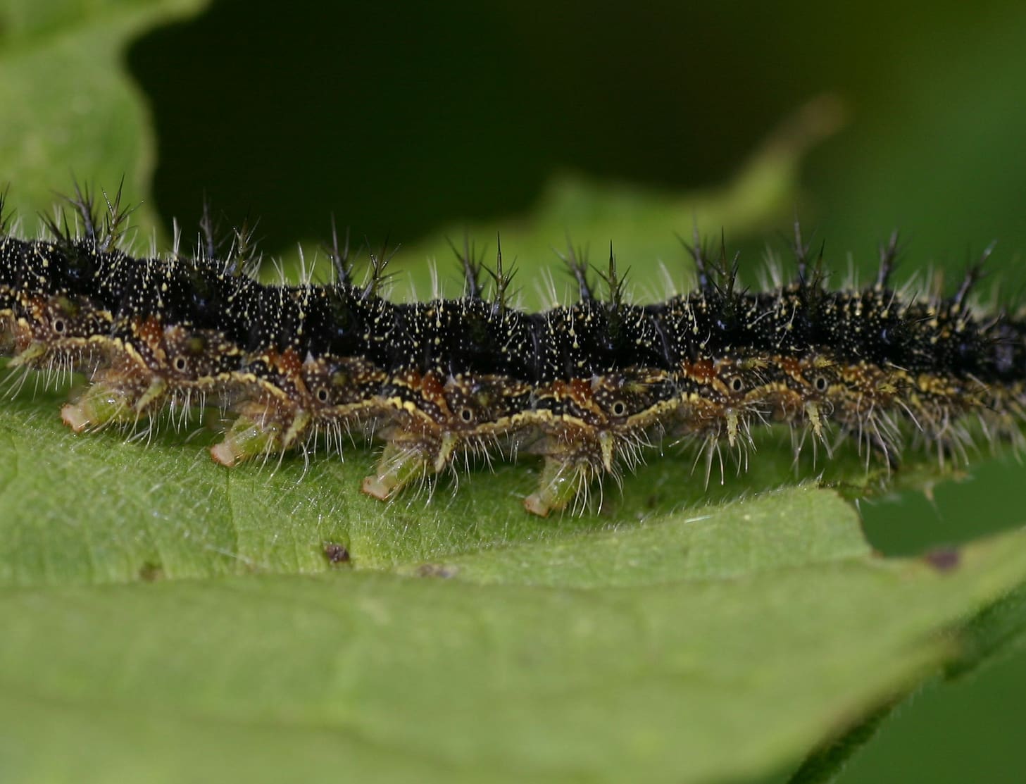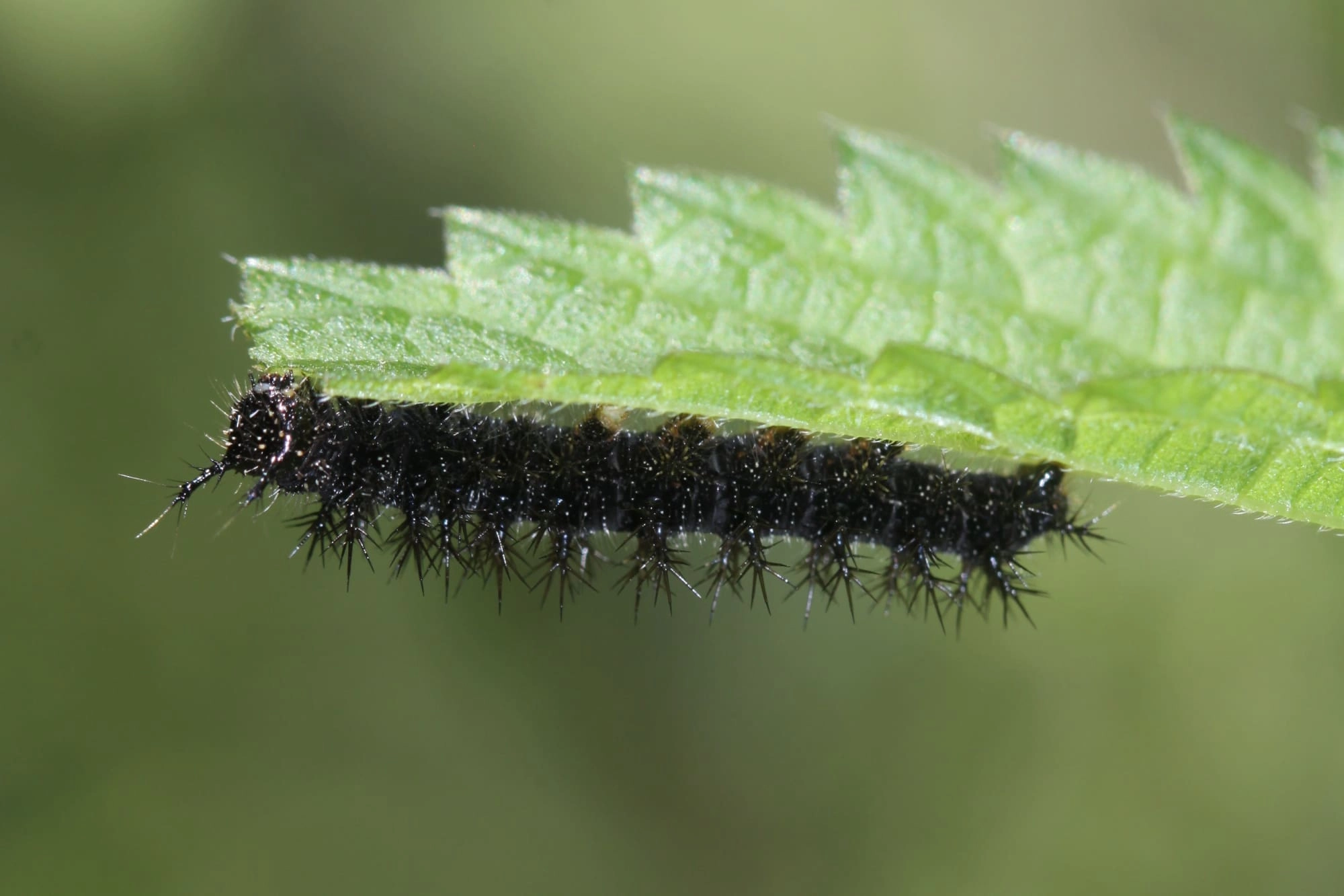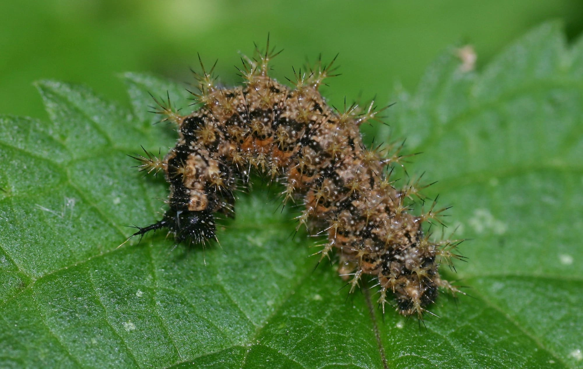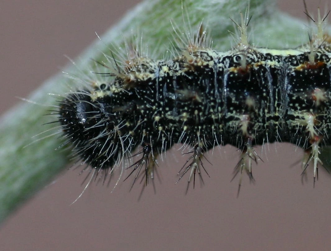 Bij de jongste rupsen zijn de doorns nog vrijwel onzichtbaar. De kleur van de rupsen kan variëren van vrijwel volledig zwart tot zwart met lichtbruin.
