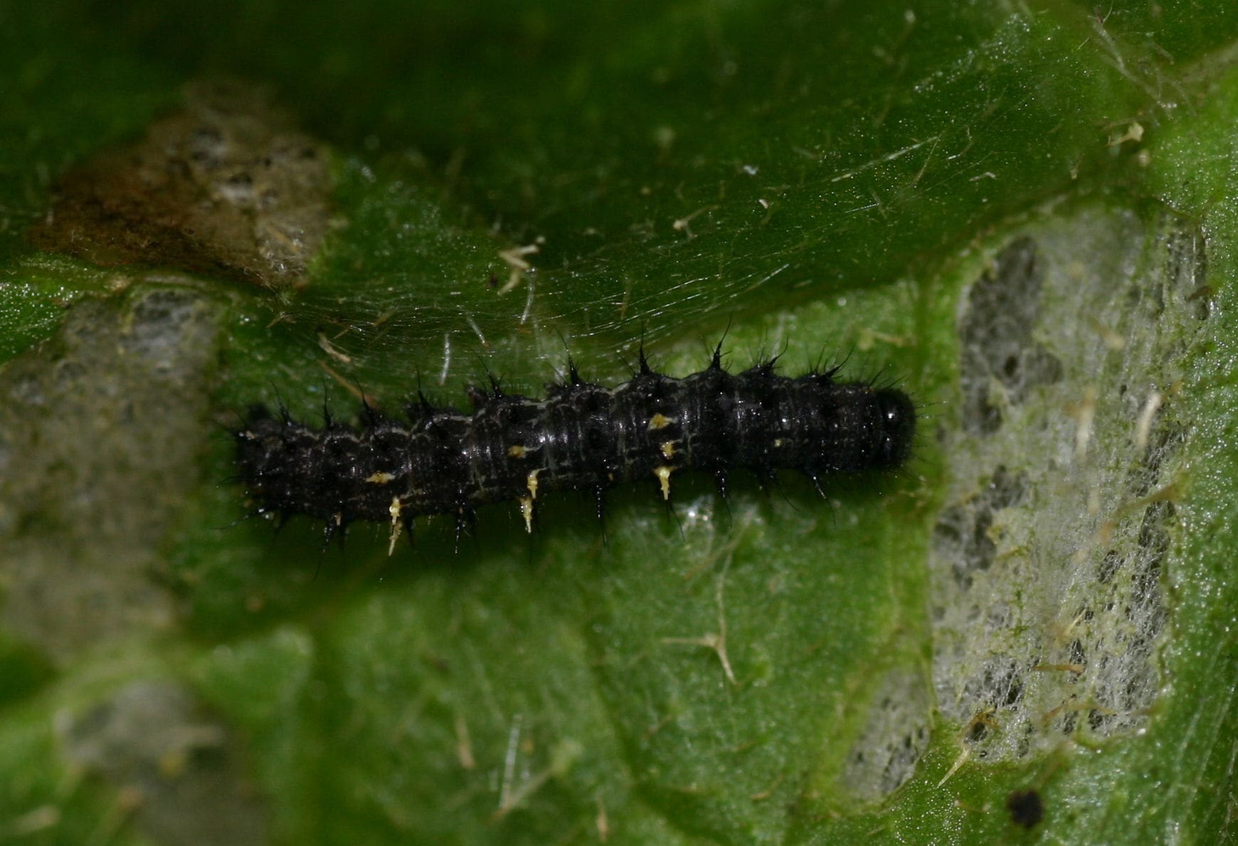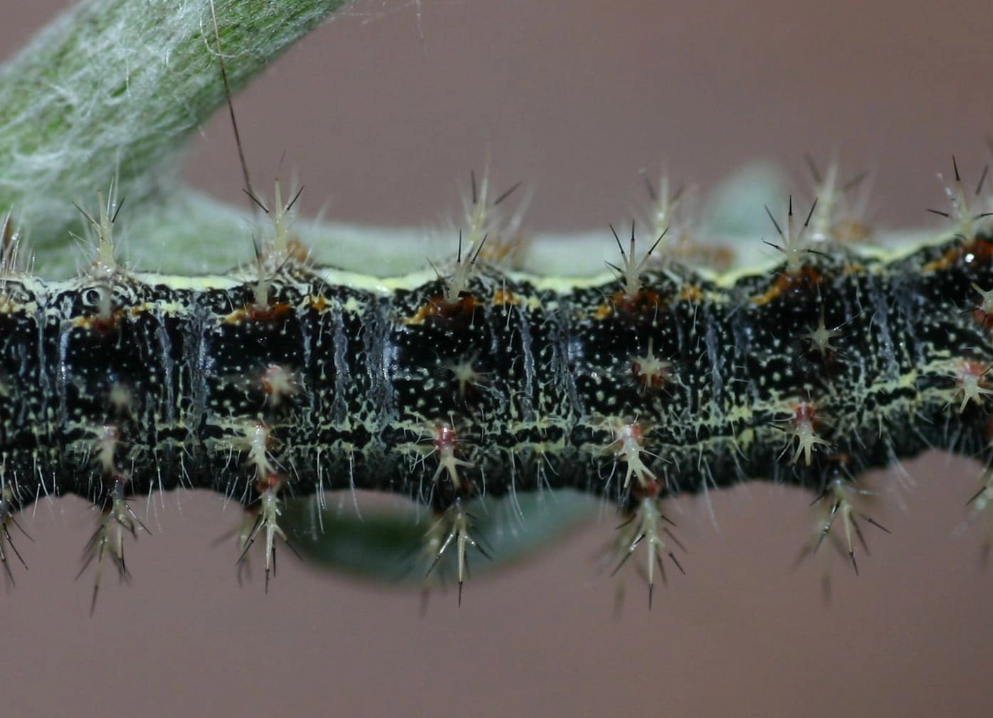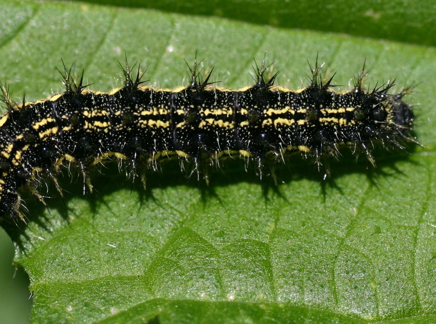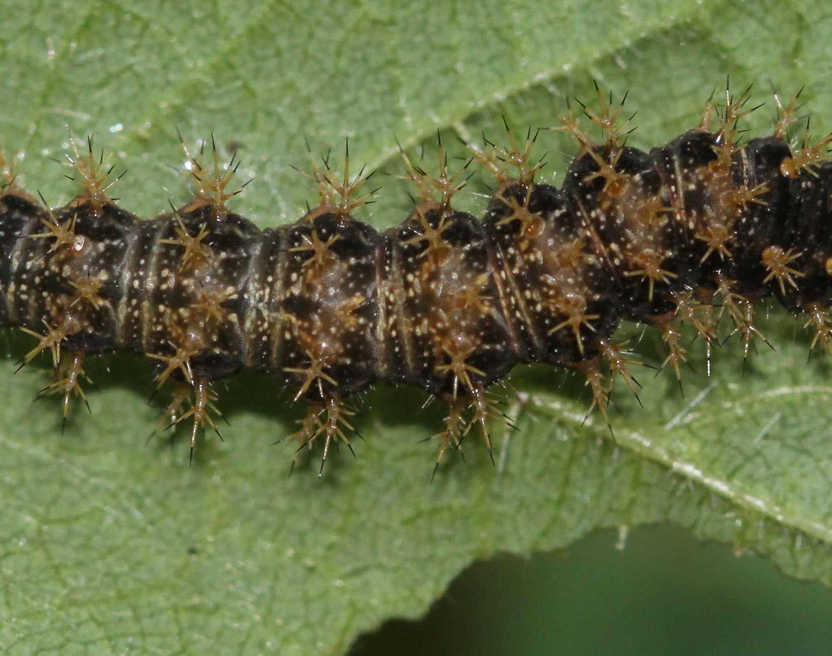 Bij de jongste rupsen zijn de doorns nog vrijwel onzichtbaar. De kleur van de rupsen kan variëren van vrijwel volledig zwart tot zwart met lichtbruin.