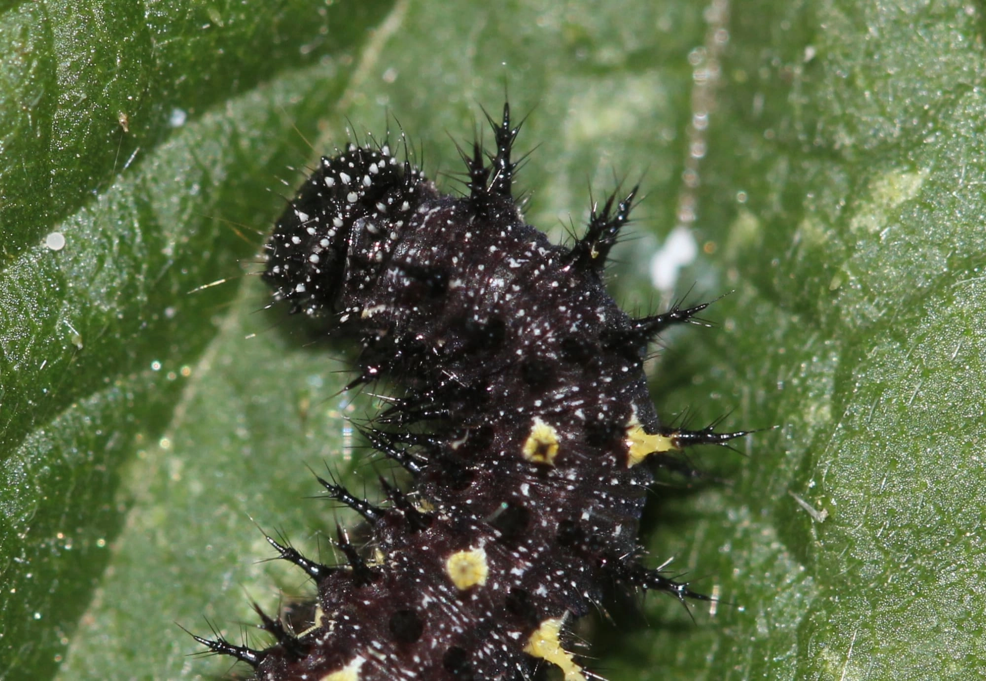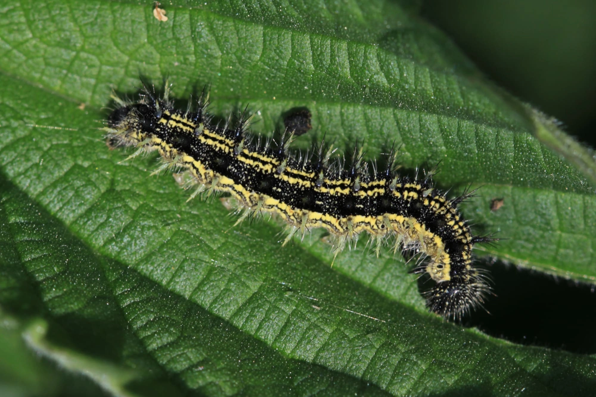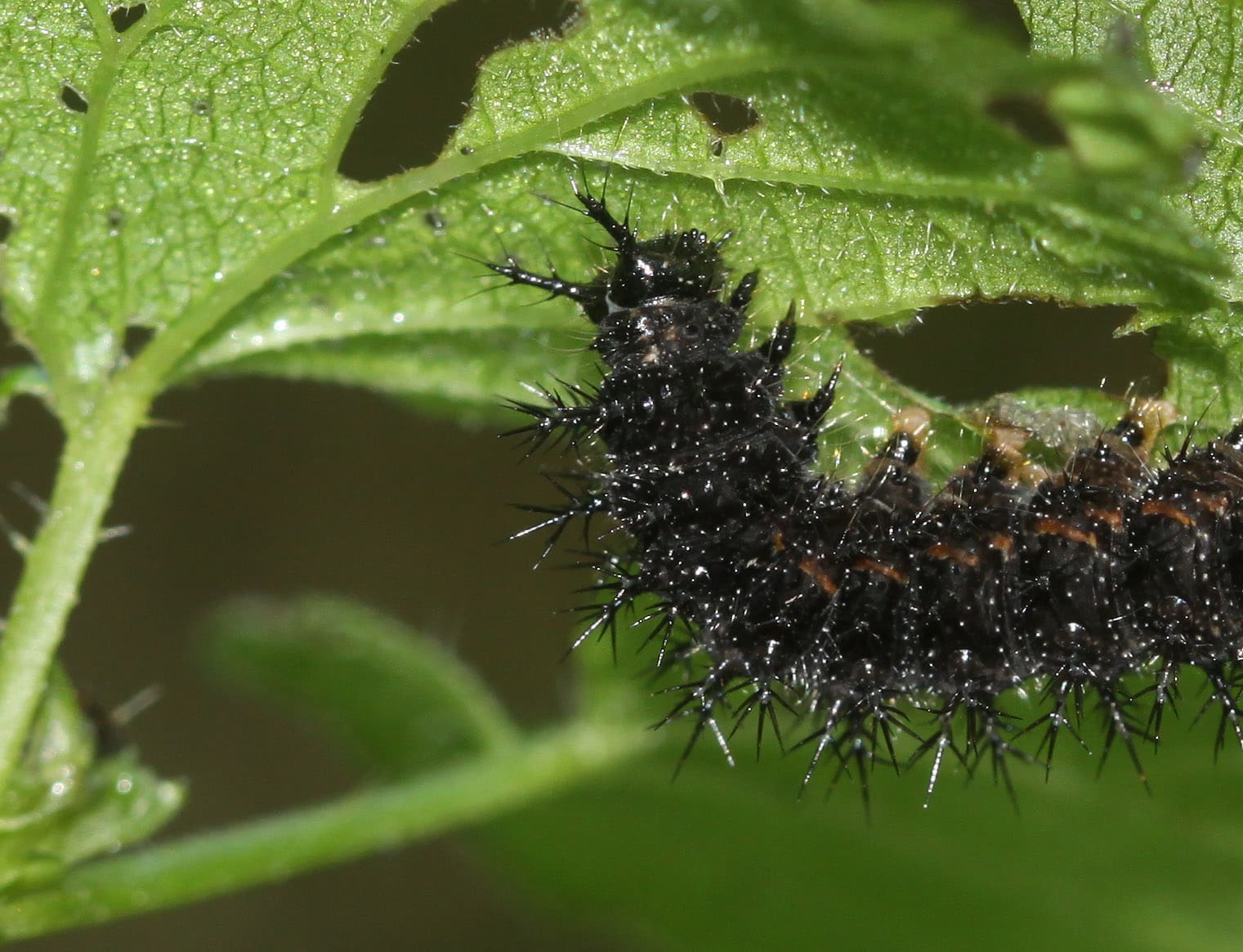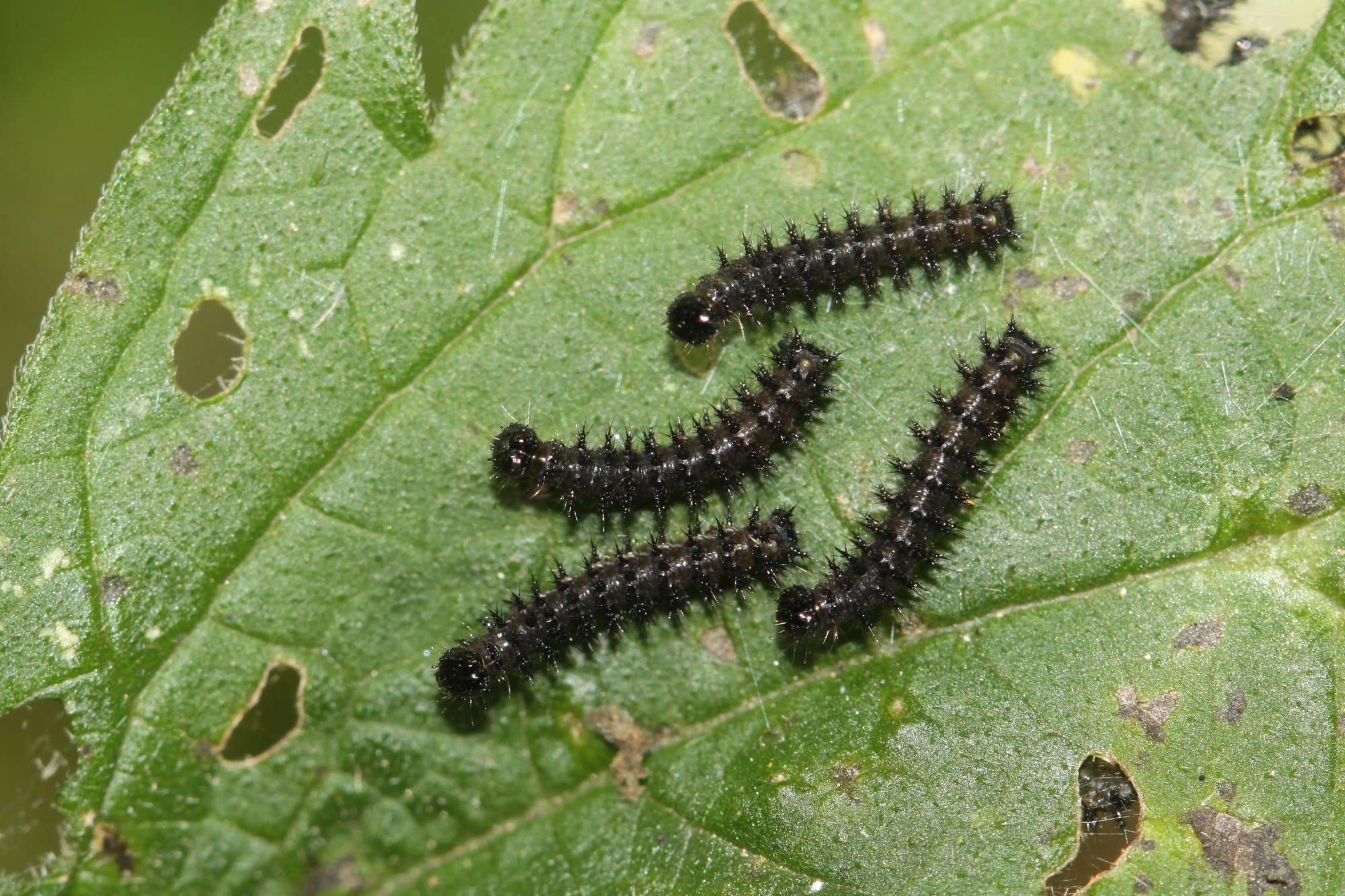 Bij de jongste rupsen zijn de doorns nog vrijwel onzichtbaar. De kleur van de rupsen kan variëren van vrijwel volledig zwart tot zwart met lichtbruin.