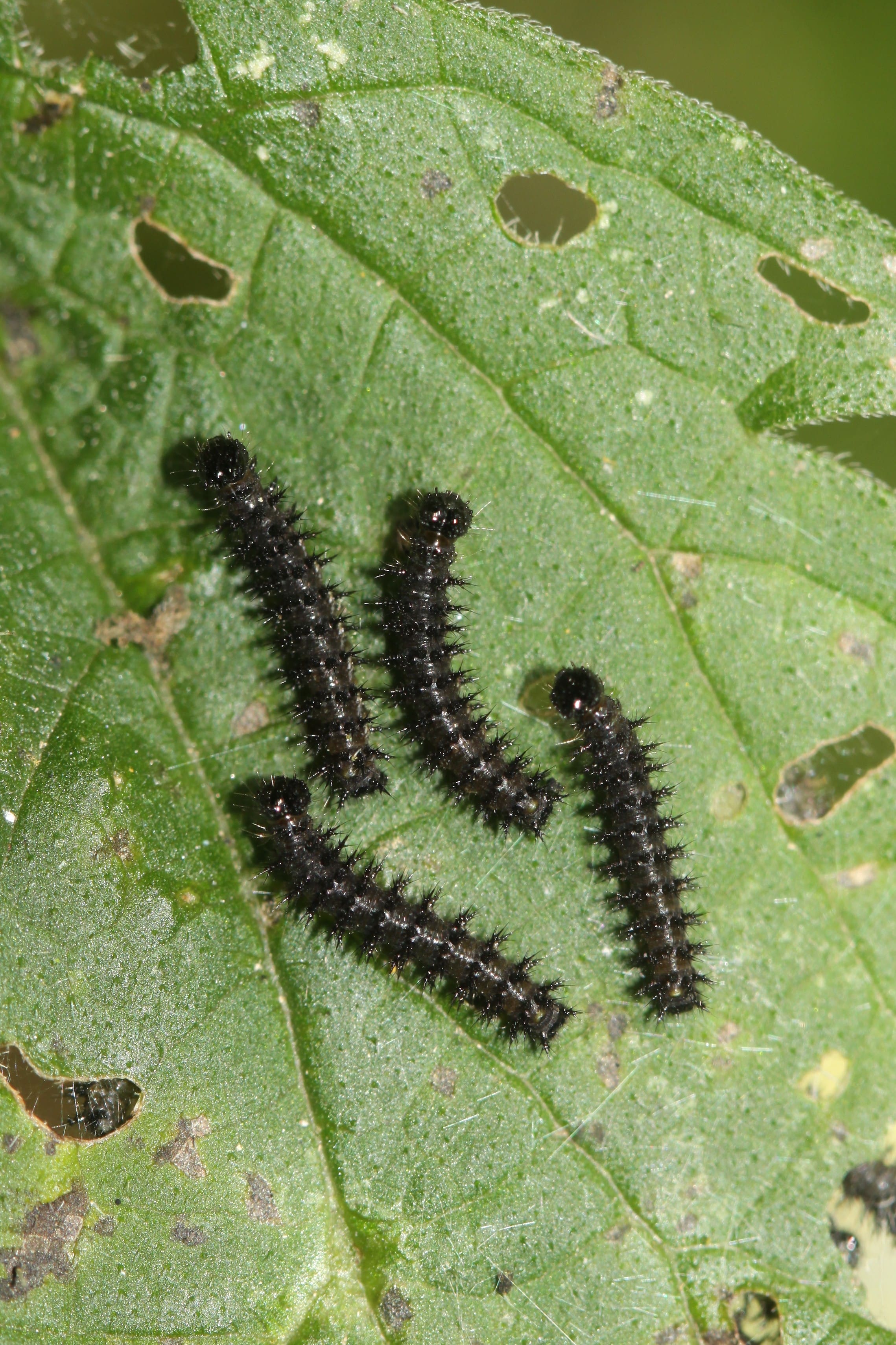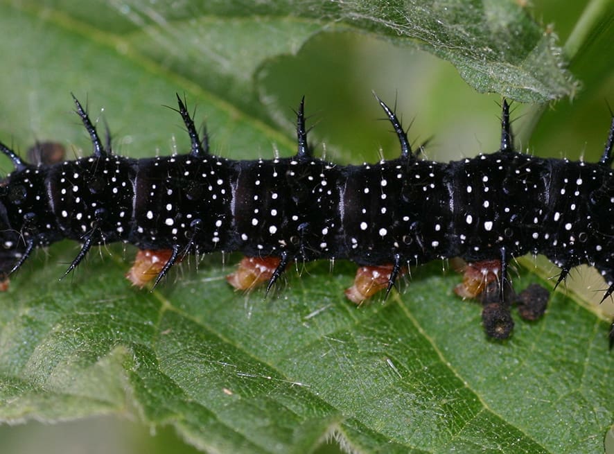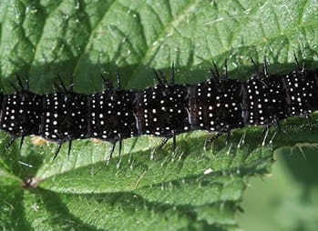 De rupsen van de dagpauwoog leven in grote groepen op grote brandnetels en soms ook op hop.