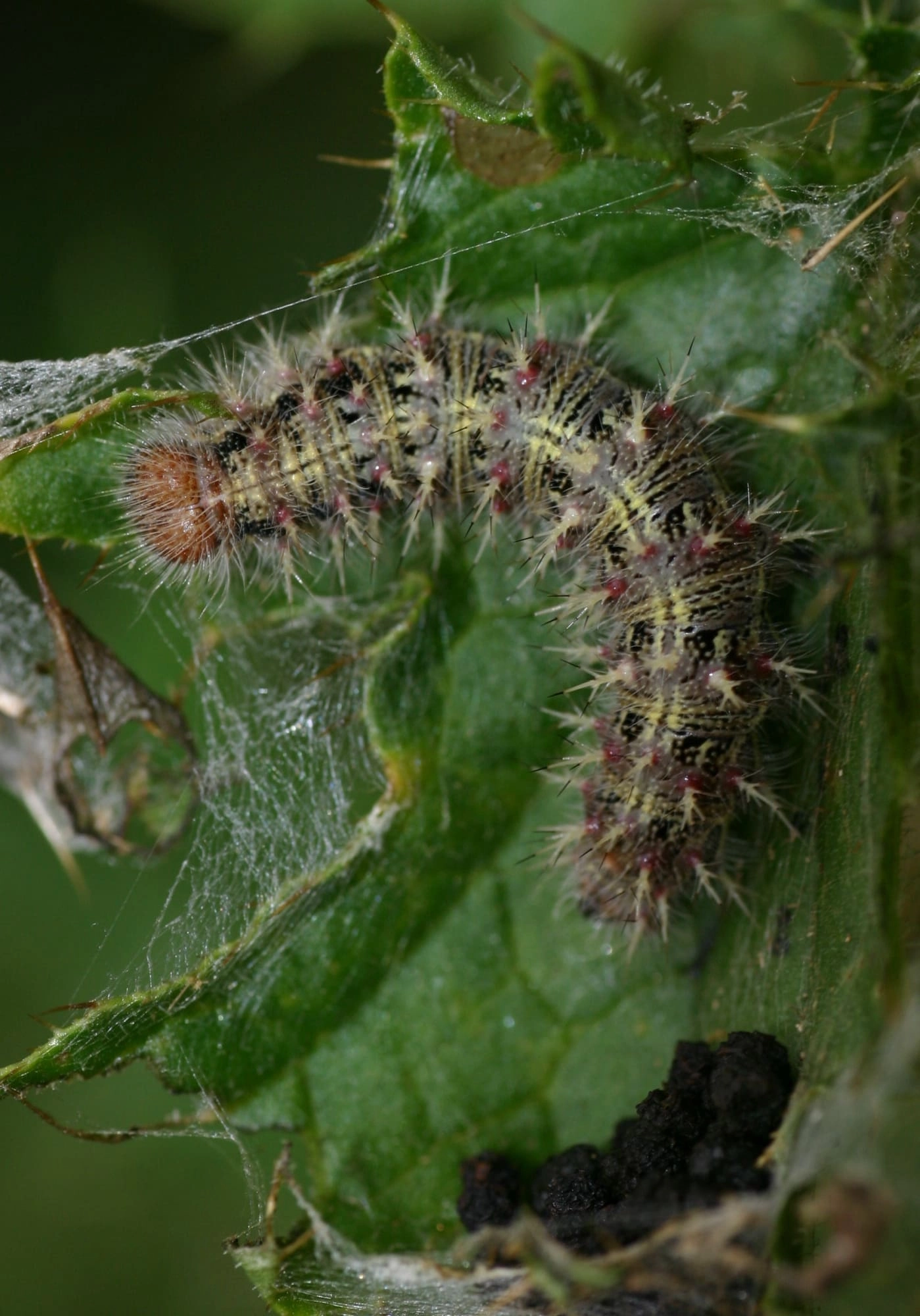De Atalanta rupsen leven solitair tussen samengesponnen bladeren van de grote brandnetel.