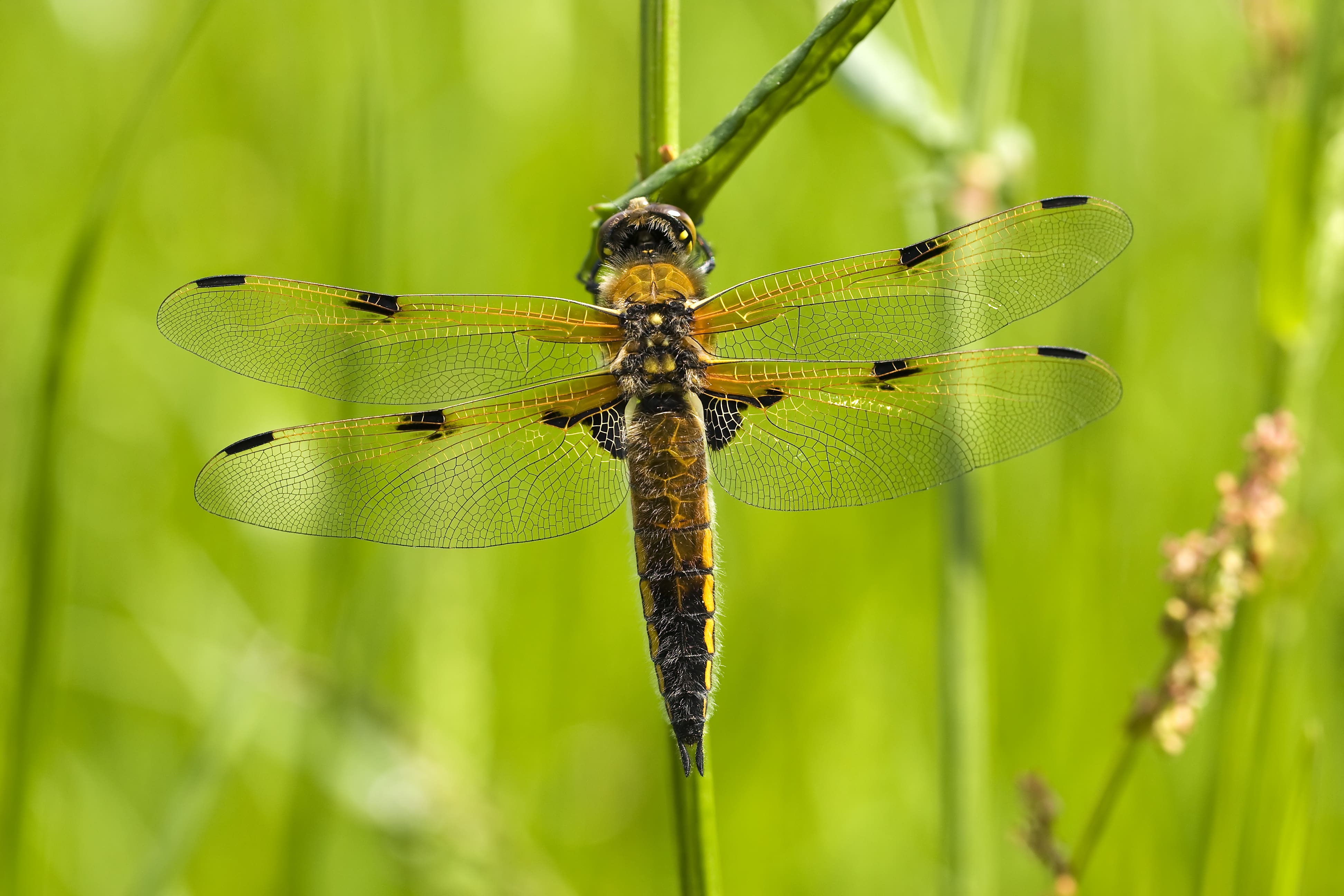 De viervlek is een algemeen voorkomende echte libel. Je kunt hem niet missen: de donkere vlek, midden in de rand van alle vier de vleugels, is heel kenmerkend.