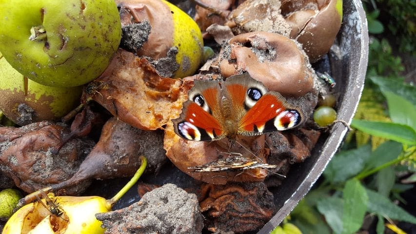 Vlinders leven niet uitsluitend van nectar uit bloemen. Atalanta’s staan erom bekend dat ze dol zijn op het sap van bloedende bomen of rottend fruit. Ook de gehakkelde aurelia en het bont zandoogje kan je hiermee lokken. Hou dode bomen dus in de gaten. Of maak zelf een lekkere fruitschaal voor vlinders!
