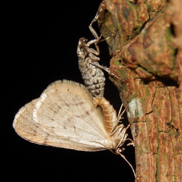 Het vrouwtje ontpopt zich aan de voet van een boom. Ze zal de rest van haar leven op deze boom doorbrengen, en heeft daarom geen vleugels nodig. De mannetjes wachten geduldig op de vrouwtjes, tot ze zich onder de boom tussen het strooisel hebben verpopt. Als de vrouwtjes uit de pop komen kruipen ze langs de boomstam op naar boven. Daar kunnen ze de wachtende mannetjes bijna niet missen. Het vrouwtje zoekt een geschikte partner en paart met hem.