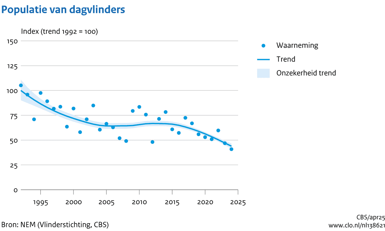 In 2024 waren de getelde aantallen vlinders het laagst sinds de start van het meetnet vlinders. Negen van de 54 onderzochte vlindersoorten, waaronder het zwartsprietdikkopje en het heideblauwtje, kenden de laagste aantallen sinds 1992. Over de hele periode gaan dertig soorten vlinders in aantal achteruit en twaalf soorten vooruit. Het donker pimpernelblauwtje – een Europees beschermde soort – is helemaal niet meer gezien. De soort lijkt uit Nederland te zijn verdwenen. Alleen van het hooibeestje werden in 2024 juist de hoogste aantallen geteld sinds 1992.