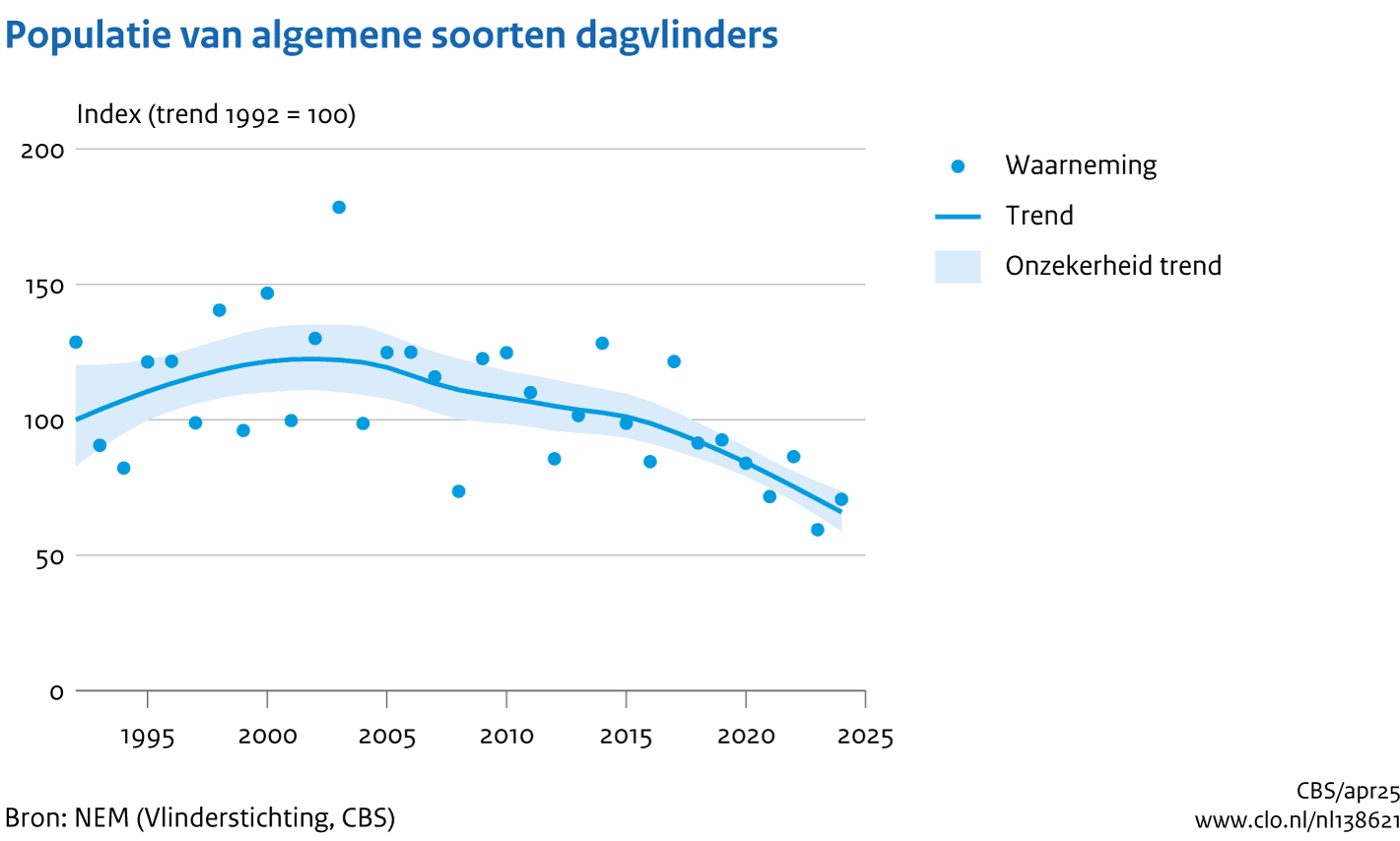 Tussen 1992 en 2024 zijn vlinderpopulaties gemiddeld met 56 procent afgenomen. De vlinderstand daalde voor het tiende jaar op rij, en bereikte in 2024 het laagste niveau sinds de start van de tellingen. De laatste jaren worden algemeen voorkomende soorten, zoals het icarusblauwtje en het groot koolwitje, steeds minder waargenomen. Dit blijkt uit nieuwe cijfers van het CBS en De Vlinderstichting.