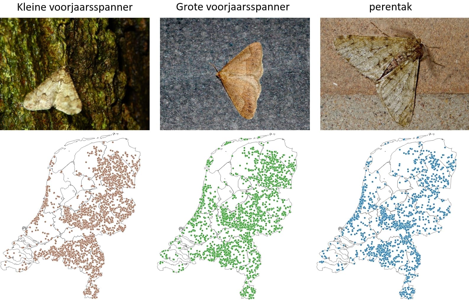 Alle drie de soorten zijn algemeen in ons land, maar ze komen niet overal voor. Buiten de zandgronden zijn het zeldzaamheden, die maar af en toe worden aangetroffen. De waardplanten waar de rupsen van eten zijn diverse loofbomen. Eik is wel de belangrijkste en voor de grote voorjaarsspanner zelfs de enige plant waarop de rupsen goed overleven. De rupsen komen vanaf april tevoorschijn, als het jonge blad aan de bomen verschijnt, en zijn te vinden tot in juni. Dan kruipen ze uit de boom naar beneden en verpoppen onder het strooisel in de grond. Om de voorjaarsspanners te zien te krijgen, kun je in het begin van de avond op zoek gaan bij verlichte plekken in de buurt van bomen of struiken. Een bushokje, een fietstunneltje of een reclamebord kunnen al meerdere vlinders opleveren. Ook met een zaklantaarn boomstammen afzoeken kan vlinders opleveren. Hoewel ze de eerste weken van januari dus vrij veel aanwezig waren, zal het op dit moment, met de lage nachttemperaturen, minder zijn. Als de nachttemperatuur weer boven de 4 à 5 graden komt, kun je ze weer volop tegenkomen. Ze vliegen tot in maart, dus nog kansen genoeg.