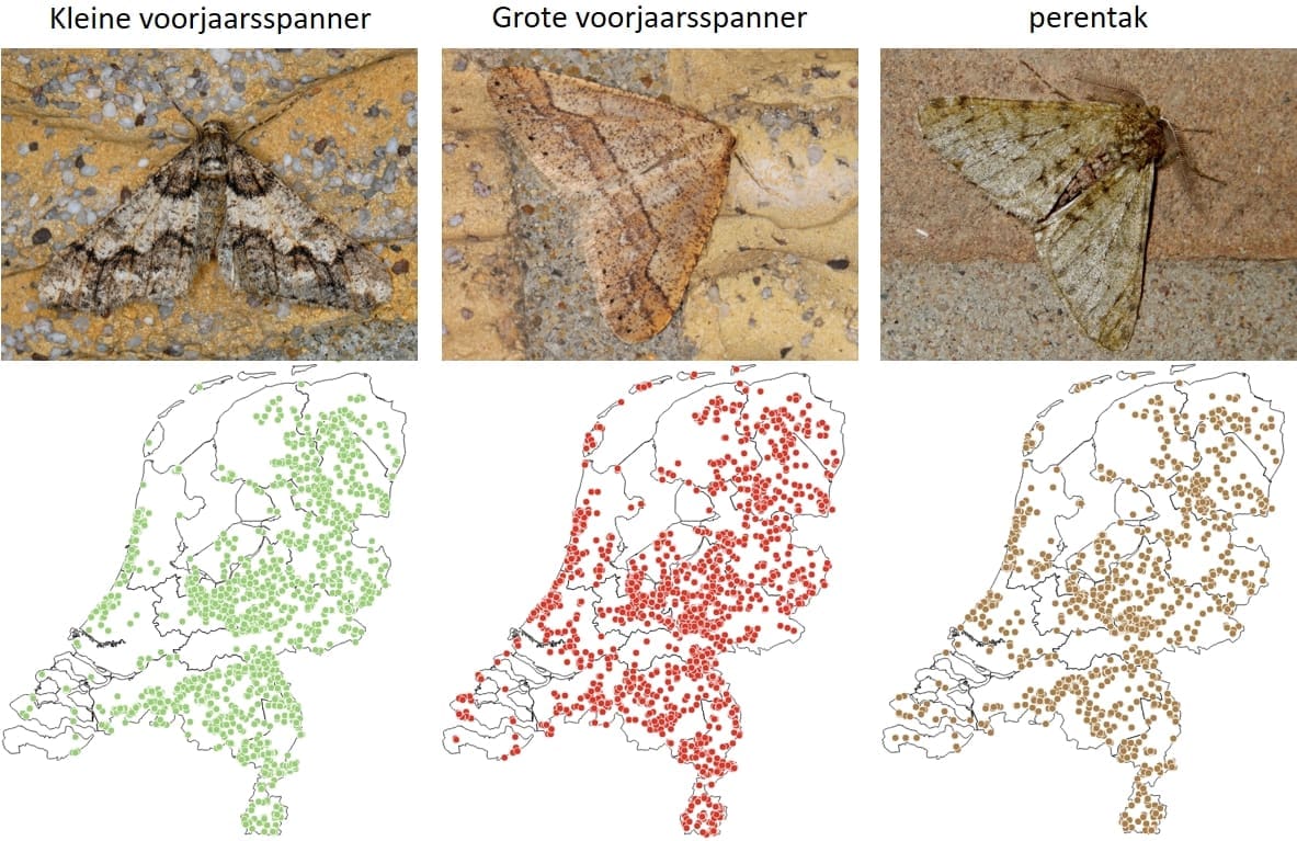 Alle drie de soorten zijn algemeen in ons land, maar ze komen niet overal voor. Buiten de zandgronden zijn het zeldzaamheden, die maar af en toe worden aangetroffen. De waardplanten waar de rupsen van eten zijn diverse loofbomen. Eik is wel de belangrijkste en voor de grote voorjaarsspanner zelfs de enige plant waarop de rupsen goed overleven. De rupsen komen vanaf april tevoorschijn, als het jonge blad aan de bomen verschijnt en zijn te vinden tot in juni. Dan kruipen ze uit de boom naar beneden en verpoppen onder het strooisel in de grond. Om de voorjaarsspanners te zien te krijgen, kun je in het begin van de avond op zoek gaan bij verlichte plekken in de buurt van bomen of struiken. Een bushokje, een fietstunneltje of een reclamebord kan al meerdere vlinders opleveren. Ook met een zaklantaarn boomstammen afzoeken kan vlinders opleveren. Hoewel ze de eerste weken van januari dus vrij veel aanwezig waren, zal het op dit moment, met de lage nachttemperaturen minder zijn. Als de nachttemperatuur weer boven de 4 tot 5 graden komt, kunt u ze weer volop tegenkomen. Ze vliegen tot in maart, dus nog kansen genoeg.