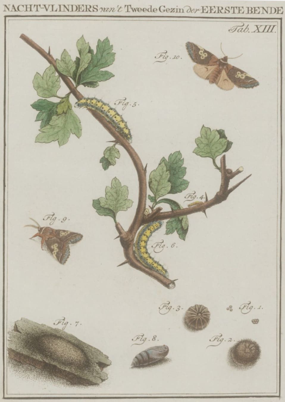 - Jan-Christiaan Sepp, Beschouwing Der Wonderen Gods In De Minstgeachte Schepzelen Of Nederlandsche Insecten, Naar Hunne Aanmerkelyke Huishouding, Verwonderlyke Gedaantwisseling En Andere Wetenswaardige Byzonderheden, Volgens Eigen Ondervinding Beschreeven, Naar’t Leven Naauwkeurig Getekend, In’t Koper Gebracht En Gekleurd (Amsterdam, 1762) deel 1.