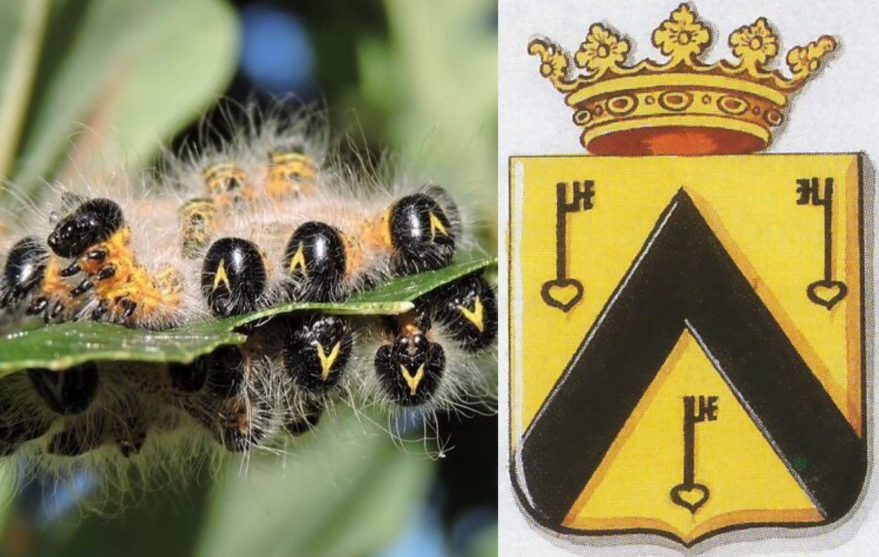 ‘Dese Rupsen sijn schoon van koleur, geel ende met swart geteyckent, dat seer wel af-steeckt. Voor aen den kop hebben sy de ghedaente van een wapen daer een keeper in staet, den grondt is swart ende den keeper geel, gelijck inde af-beeldinghe A. te sien is. (…) Om sijn gedaentes wille, gaf ick hem den naem vanden geelen-wapen-drager.’