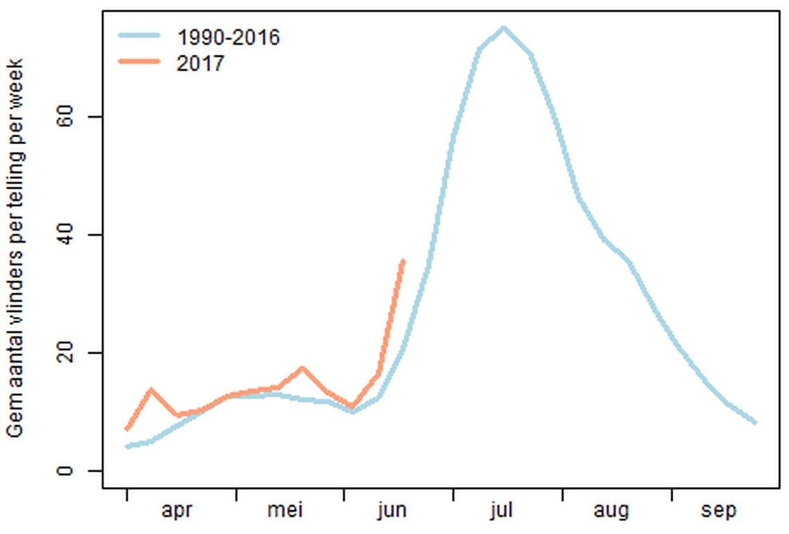 Tot dusver zijn er meer vlinders geteld in de routes van het Landelijk Meetnet Vlinders dan het gemiddelde over de jaren 1992-2016. Dat heeft zeker ook te maken met het goede weer. In april was het weliswaar niet heel warm, maar wel waren er erg veel zonuren en de dagvlinders zijn zonaanbidders en gebruiken de zonnestralen om de gewenste temperatuur van 30 graden te bereiken. In mei was het wel erg warm en ook nog zonnig, dus ook toen hebben de vlinder volop gevlogen. Ook juni is tot nu toe erg warm, zonnig en droog en ondanks de gebruikelijke junidip, zijn er ook nu veel vlinders te zien. Vooral bruin zandoogje, groot dikkopje en atalanta worden erg veel gemeld. Voor veel vlinderaars is 2017 tot nu toe dan ook een prima vlinderjaar. Maar is het ook goed voor de vlinders?