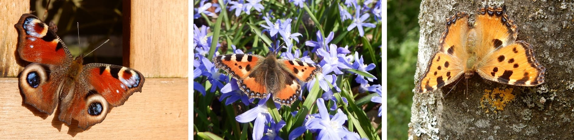 Vlinders die vooral in holle bomen, schuurtjes, bunkers en op zolders overwinteren, v.l.n.r.: dagpauwoog, kleine vos en grote vos (Bron: Kars Veling)